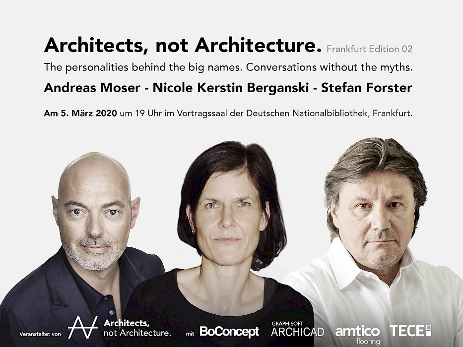 Neben den Frankfurter Architekten Nicole Kerstin Berganski und Andreas Moser spricht Stefan Forster in der kommenden Ausgabe der Reihe über seinen Werdegang und frühe architektonische Prägungen – von der Jugend im pfälzischen Imsbach bis zum Studium an der TU Berlin, vom Stipendium in Venedig bis zur Bürogründung in Darmstadt. Am 5. März 2020 um 19 Uhr in der Deutschen Nationalbibliothek, Frankfurt am Main.