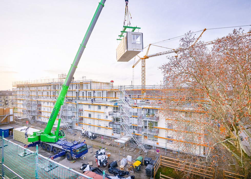 Unser Projekt Platensiedlung ist ein gutes Beispiel dafür, wie Nachverdichtung durch modulare Bauweise umgesetzt werden kann. Die bestehenden Zeilenbauten werden mittels einer modular aufgebauten Holzkonstruktion von drei auf fünf Geschosse aufgestockt und um sechsgeschossige, quer zu den Zeilen angeordnete Kopfbauten ergänzt. Durch die veränderte Bebauungsstruktur und die architektonisch betonten Kopf- und Torbauten entstehen klar definierte Stadträume, die sich am großstädtischen Block orientieren. Bis 2023 werden insgesamt 681 neue Wohnungen realisiert, je zur Hälfte im geförderten Wohnungsbau und in freier Finanzierung.