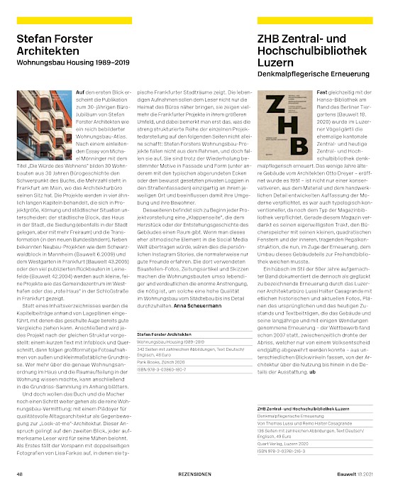 Rezension: „Stefan Forster Architekten – Wohnungsbau 1989–2019“, Bauwelt, 18/2021