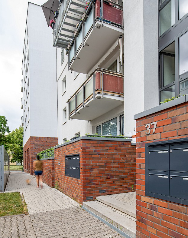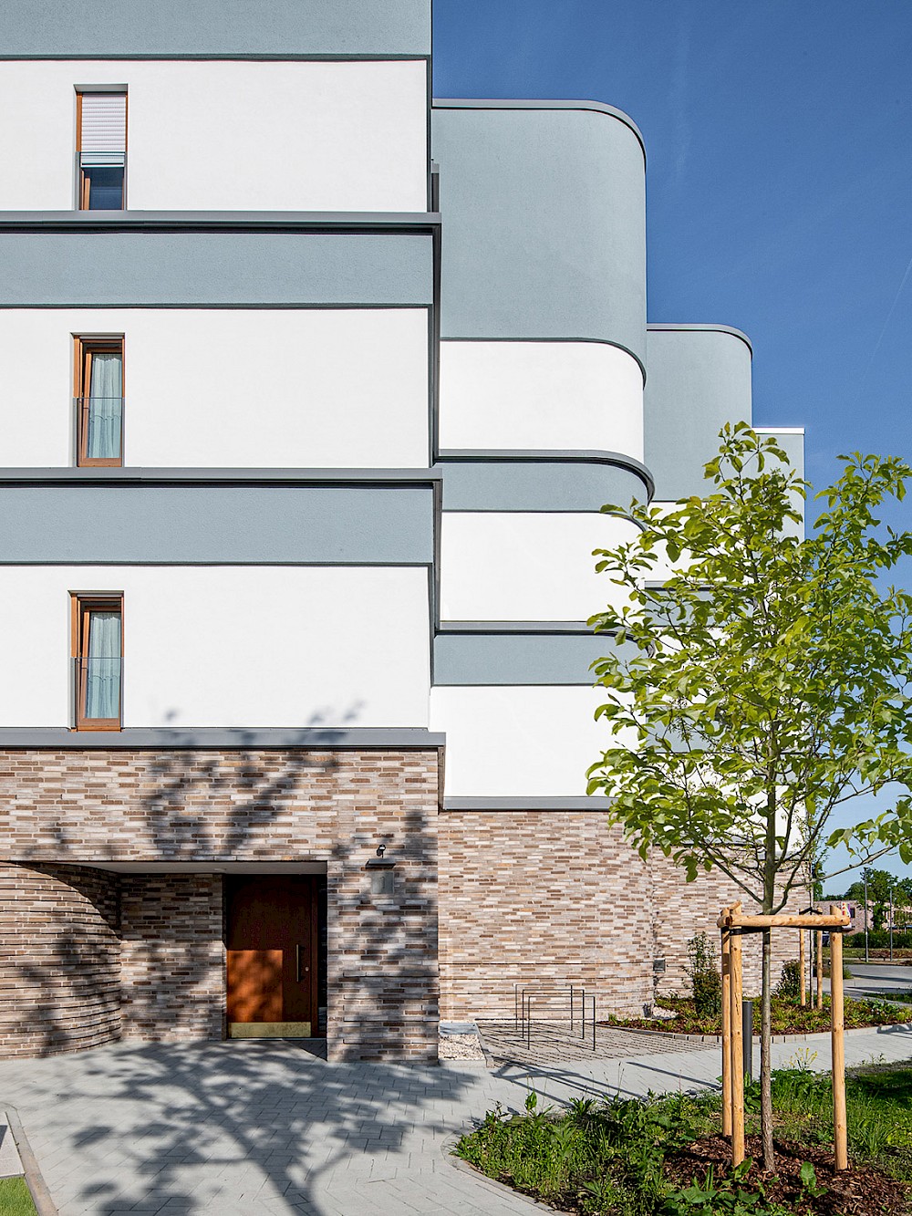 Im Auftrag der kommunalen Wohnungsbaugesellschaft Stadtbau Aschaffenburg GmbH konnten wir hier ein Projekt realisieren, das sich ganz wesentlich von den üblichen Wohnungsbaukisten unterscheidet. Auch hier haben wir versucht, gegen den Mainstream zu steuern und unsere eigene Messlatte bezüglich Qualität und Gestaltung anzulegen. So ist es uns gelungen, durch den Einsatz von Ziegeln auf das unsägliche WDVS-Fassadenmaterial verzichten zu können. Dieses Gelingen von Projekten ist immer abhängig davon, mit wem wir sie realisieren.