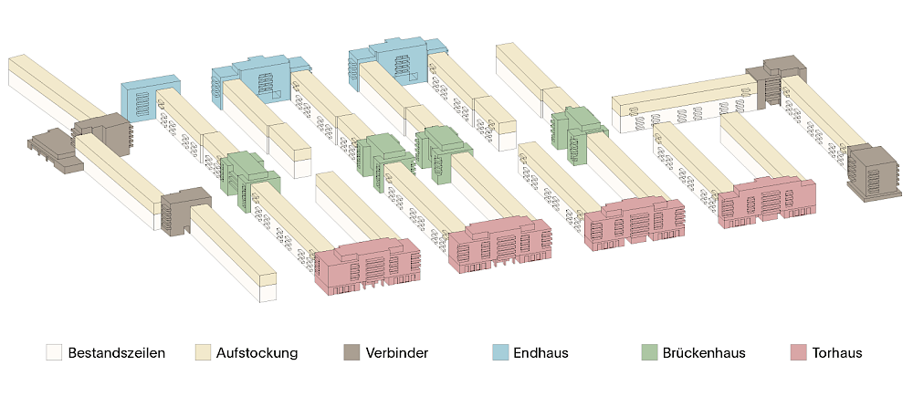 Die Neubauten ersetzen den nicht mehr sanierungsfähigen Bestand entlang der Hagener Straße durch je drei neue Baukörper auf jeder Seite. Die Zwischenräume schaffen Durchwegungen, die den Stadtteil mit der Umgebung vernetzen. Der städtebauliche Entwurf folgt dem Prinzip der Rhythmisierung und Gliederung, wodurch die Baukörper als eine Einheit wahrgenommen werden. Fünfgeschossige Kopfbauten akzentuieren die Eingänge des Quartiers an West- und Ostseite. Mit plastisch gestalteten Straßenfronten – eingeschnittenen Eingängen, auskragenden Erkern und variierenden Traufkanten – entsteht ein lebendiges Fassadenbild aus hochwertigem, warmtonigem Klinker.