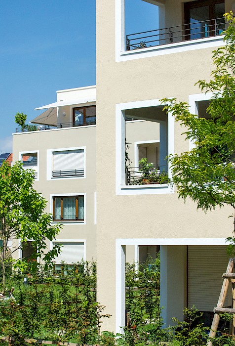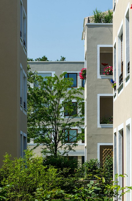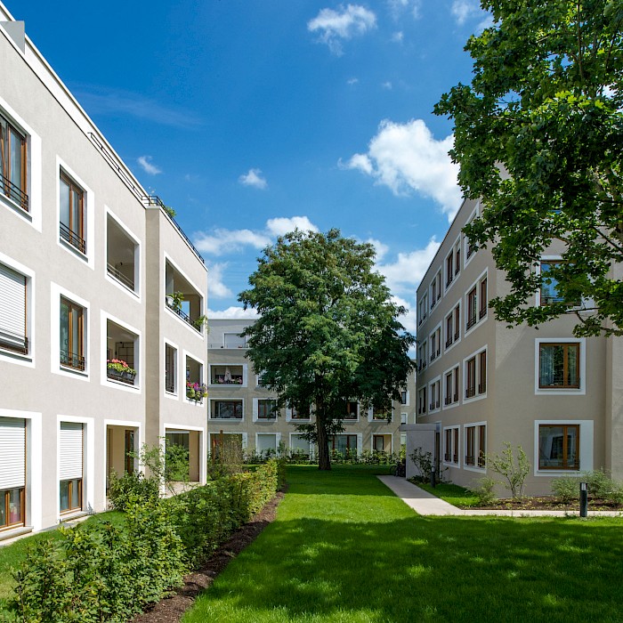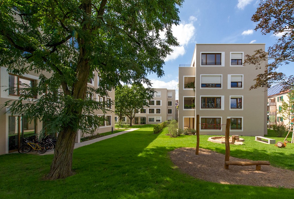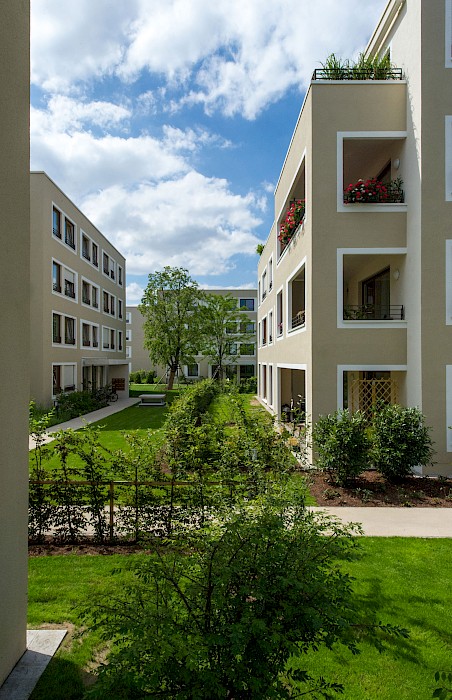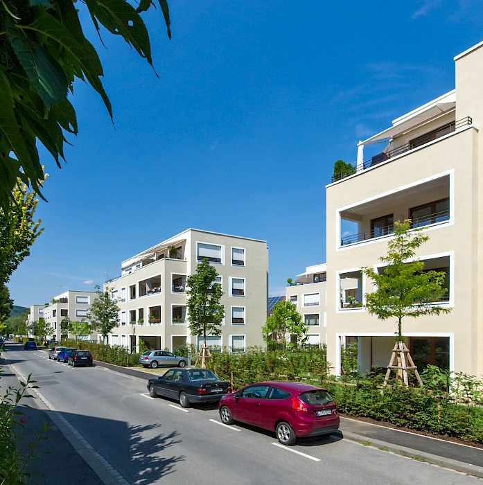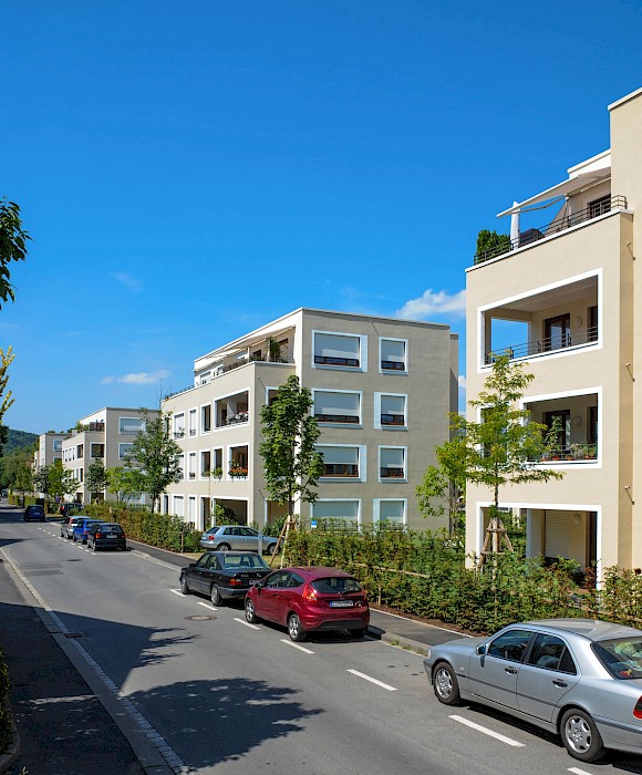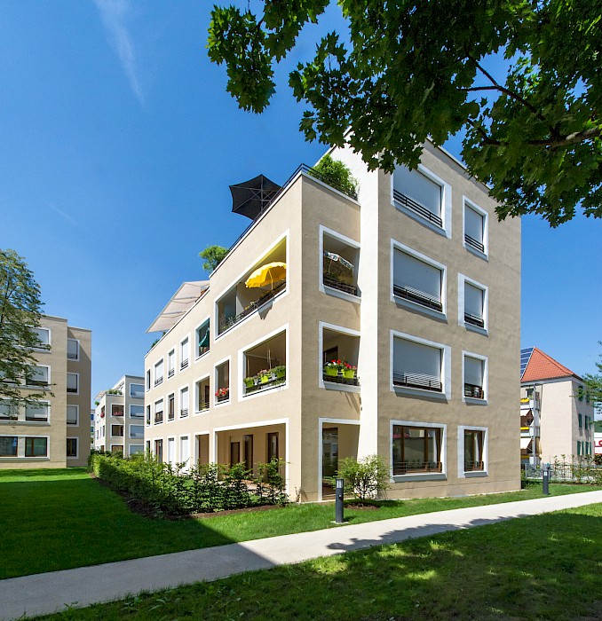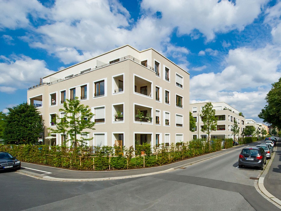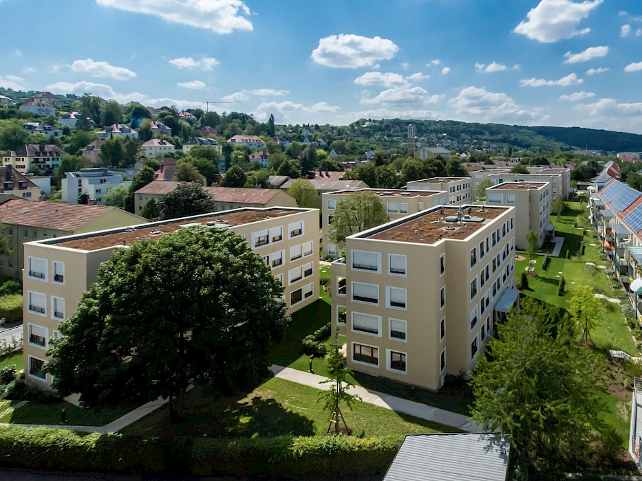 Die Wohnanlage im Würzburger Stadtteil Zellerau, der 2007 in das Städtebauförderprogramm „Die soziale Stadt“ aufgenommen wurde, ersetzt eine konventionelle Zeilenbebauung aus den 1950er-Jahren. Neun rechteckige Einzelhäuser mit jeweils 10-15 Wohnungen sind versetzt zueinander angeordnet und ermöglichen den Erhalt des prägenden alten Baumbestands. Die Anordnung der Häuser schafft durch differenzierte Außenräume eine parkähnliche Landschaft und vermittelt städtebaulich zwischen den unterschiedlichen Bebauungsstrukturen im Umfeld der Anlage. Die Wohnanlage hat insbesondere mit ihrer sozialen Mischung aus geförderten und frei finanzierten Miet- sowie Eigentumswohnungen, einer individuellen Wohnungsausstattung mit vollständiger Barrierefreiheit und den qualitätsvollen Außenräumen einen neuen Maßstab für den Wohnungsbau in Würzburg gesetzt. Insgesamt entstanden 42 Eigentums-, 50 Miet- und 12 Sozialwohnungen.