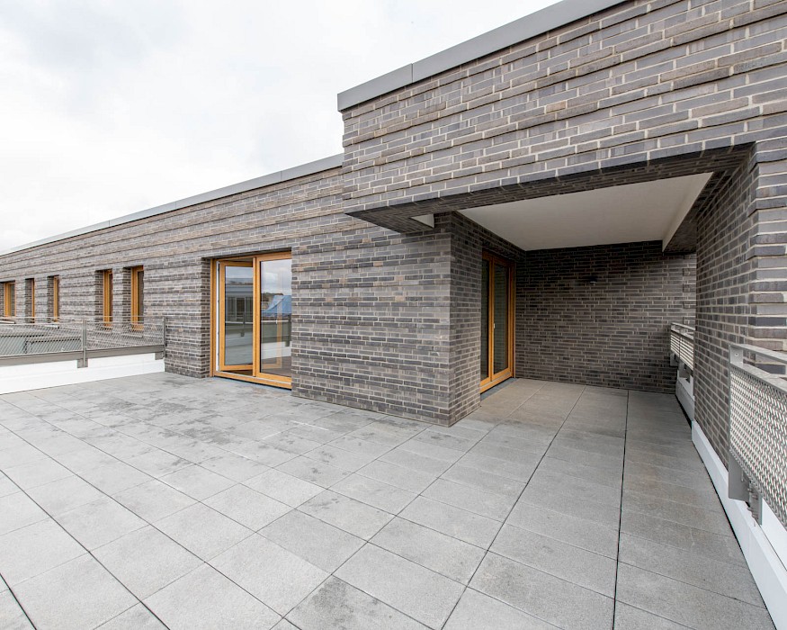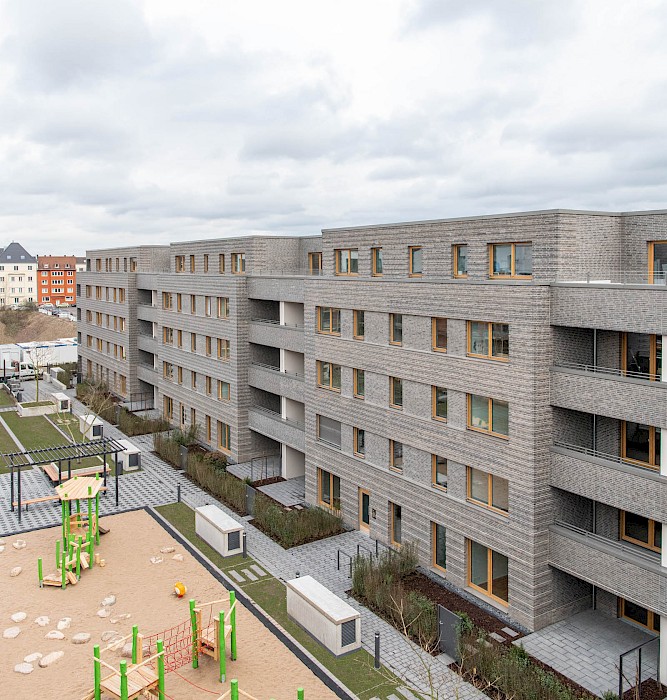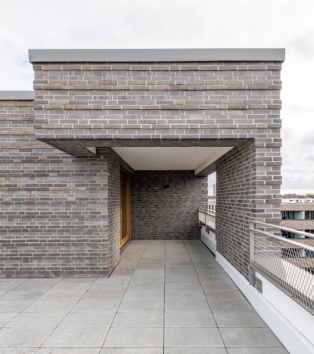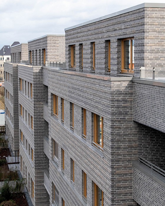 Der Entwurf basiert auf einem L-förmigen Baukörper, der dem Blockrand folgt und eine klare städtebauliche Kante zum Luftschiffplatz bildet. Die Fassade wird durch Einschnitte im Dachgeschoss rhythmisiert – ein Verfahren, das zugleich die Identität der einzelnen Häuser nach außen sichtbar macht. Der Neubau zeichnet sich durch wertige Materialien, die fein detaillierte Klinkerausführung und den differenzierten Fassadenaufbau aus. Entstanden sind 77 Zwei- bis Vierzimmer-Wohnungen mit großzügig bemessenen Freibereichen in Form von Loggien, Privatgärten oder Dachterrassen.