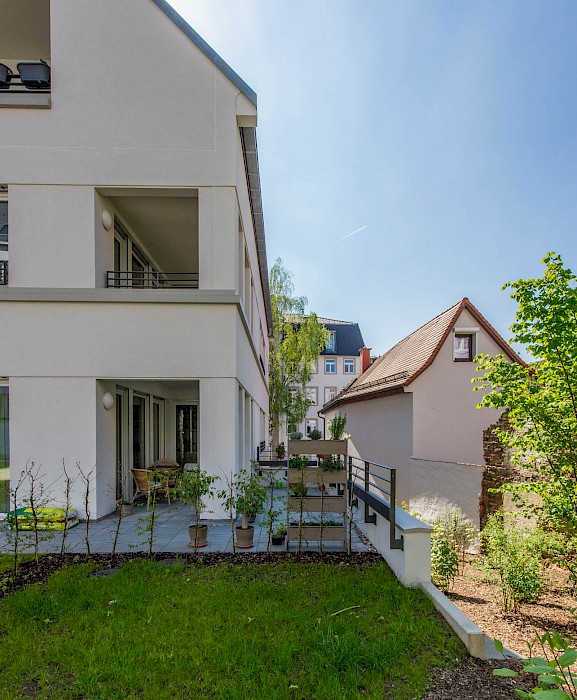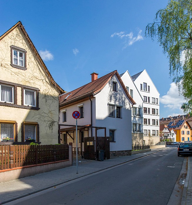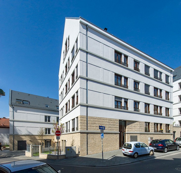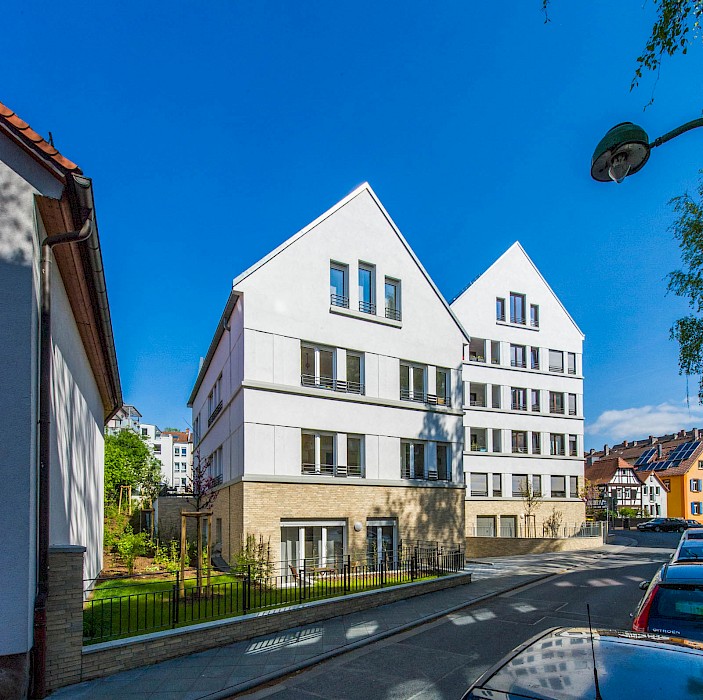 Die drei Neubauten bereichern als eigenständiges, zeitgemäßes Ensemble das Quartier um einen neuen Identifikationspunkt. Die Ensemblewirkung wird durch eine einheitliche Gestaltung und gleiche Proportionen bei allen Häusern erzielt und zusätzlich durch eine umlaufende Sockelzone aus Ziegelmauerwerk verstärkt. Auf eine äußerliche Differenzierung zwischen den Eigentumswohnungen und den Mietwohnungen wurde bewusst verzichtet. Die Erdgeschosswohnungen sind ins Hochparterre verschoben. Der Sockel schafft auf Straßenniveau einen robusten Gebäudeschutz und vermittelt Wertigkeit. Er bezieht sich zudem auf die umliegenden Fachwerkhäuser mit ihrem Steinsockel.