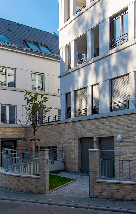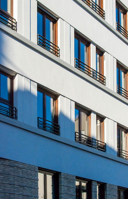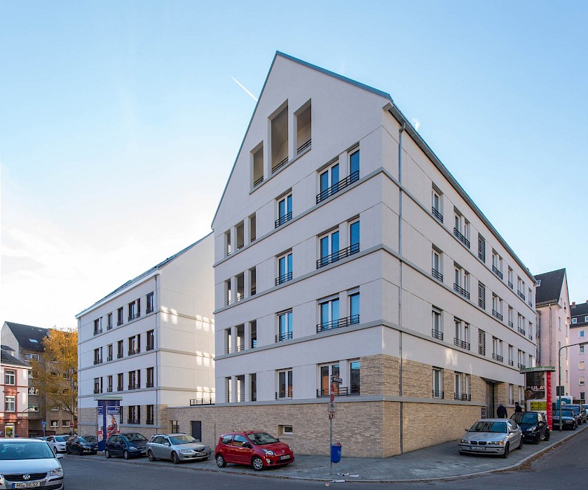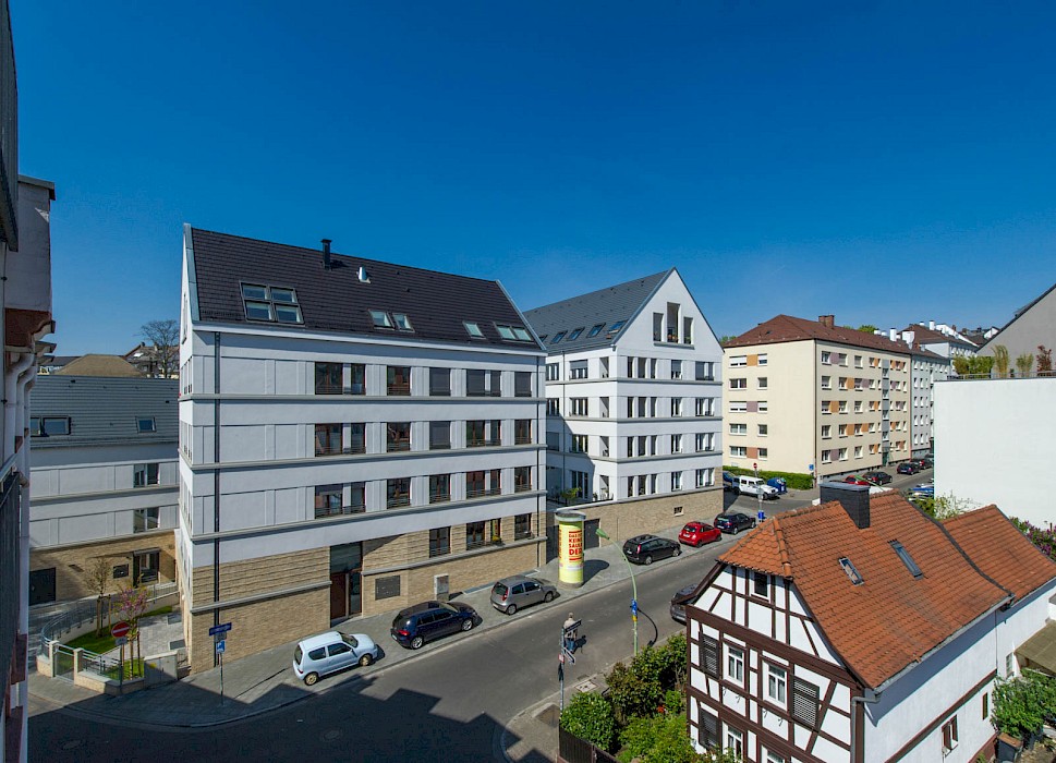 Im Frankfurter Stadtteil Bornheim stoßen dörfliche Strukturen unvermittelt mit gründerzeitlicher Blockrandbebauung zusammen. An dieser Schnittstelle ersetzt der Neubau des Wohnensembles aus drei Gebäuden ein nicht mehr sanierungsfähiges Bestandsgebäude und einen Parkplatz.