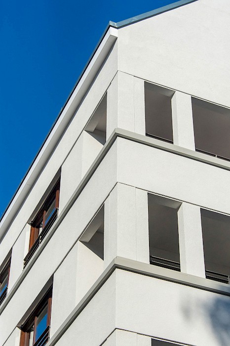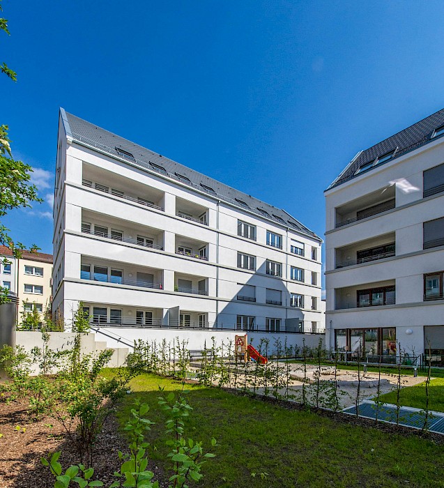 Auf auskragende Balkone wird zugunsten von großzügigen Loggien verzichtet. Die Bauten bilden durch ihre Anordnung einen gemeinsamen, halböffentlichen, grünen Innenhof, der durch private Gärten vor den Erdgeschosswohnungen zoniert wird.