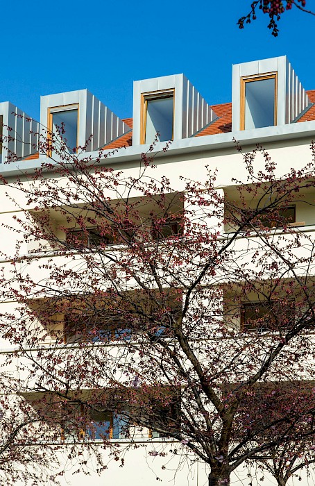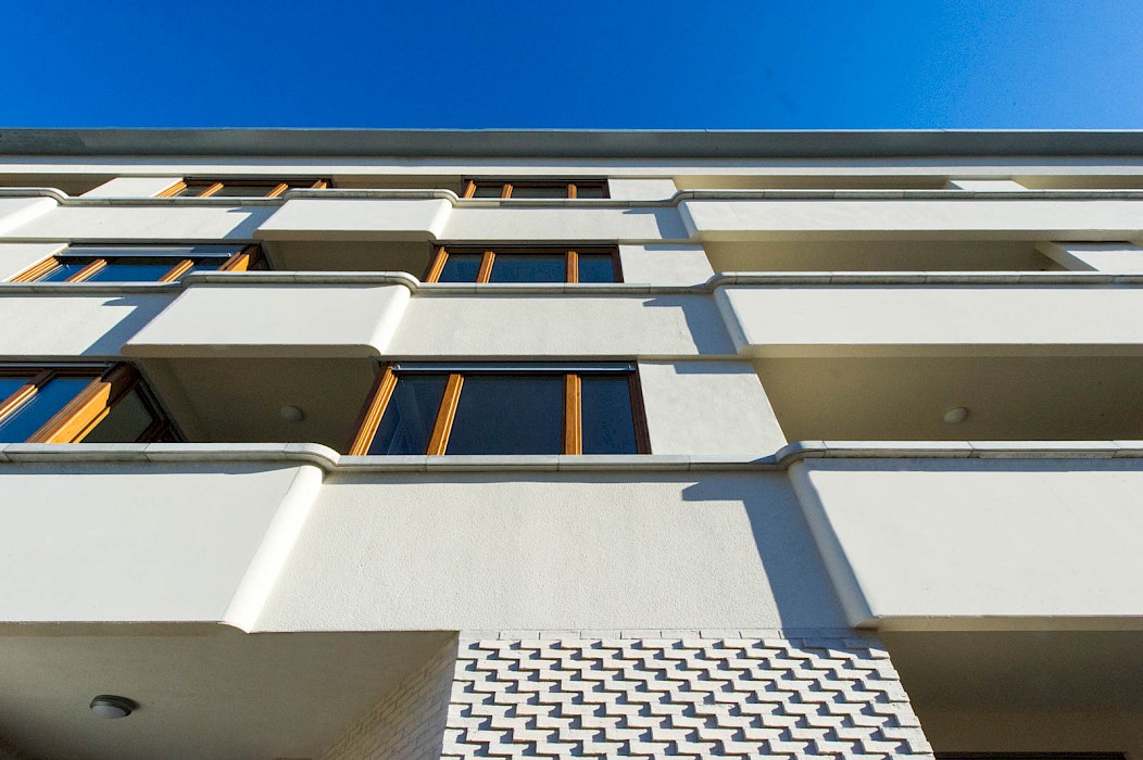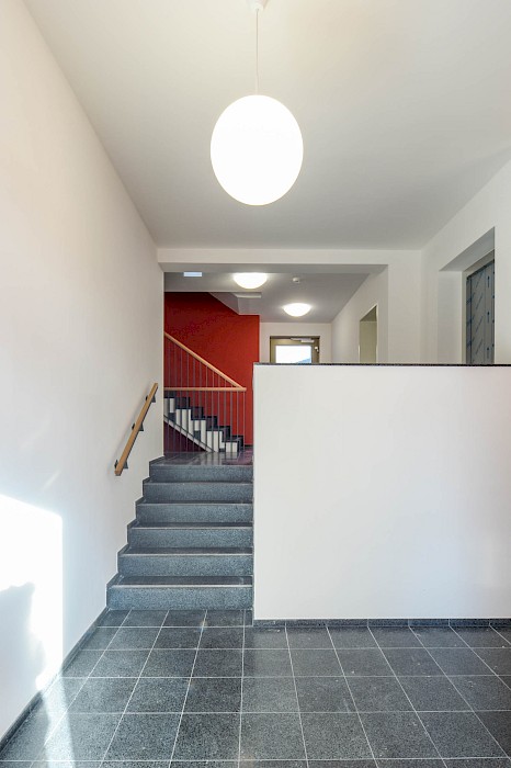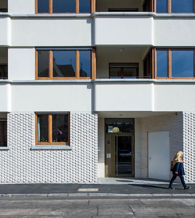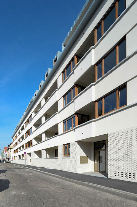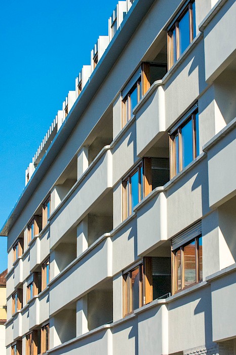 „Städtebaulich sorgsam integriert verfügt der Neubau über 57 moderne Wohneinheiten. Acht Vier-Zimmer-Wohnungen, 25 Zwei-Zimmer-Wohnungen und 24 Drei-Zimmer-Wohnungen ergeben eine Gesamtwohnfläche von rund 4 800 Quadratmetern.“