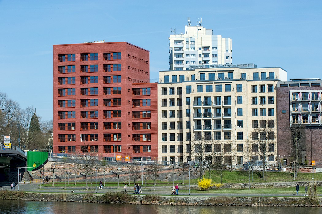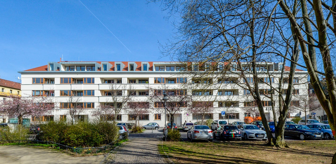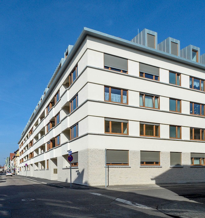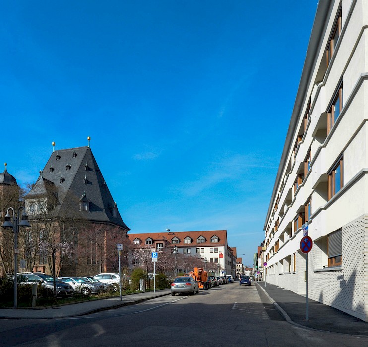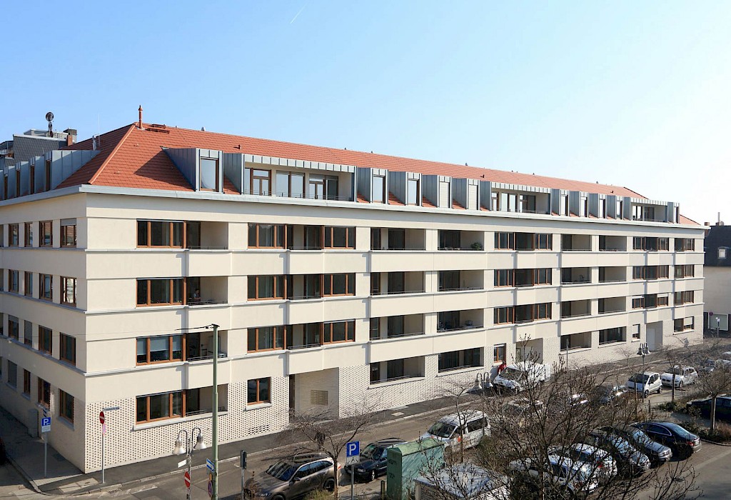 Für die kommunale Wohnungsbaugesellschaft planten Stefan Forster Architekten den Ersatzneubau an der Ostseite des Platzes. Der 1952 errichtete Vorgängerbau wies gravierende Mängel der Bausubstanz auf und entsprach mit seinen zu kleinen Grundrissen, den engen Treppenhäusern und maroden Sanitäranlagen nicht mehr den zeitgemäßen Wohnstandards. Wie sein Vorgänger folgt der U-förmige, zurückhaltend gestaltete Neubau präzise dem Blockrand und bildet eine eindeutige Platzkante nach Westen aus. Die Proportionen des Baukörpers, die Materialität der Fassade und die Dachform orientieren sich am Leitfaden für die Gestaltung der Innenstadt, der sogenannten »Fassadenfibel«, und fügen sich in den Kontext der südlichen Innenstadt ein. Auf dem massiven Klinkersockel mit erhöhtem Erdgeschoss setzen drei Obergeschosse mit großen Verglasungen und unterschiedlichen Putzstrukturen an. Das rötliche Satteldach mit markanten Dachgauben ist an das historische Hanauer Stadtbild angelehnt. Die Wohnungen verfügen straßenseitig über eine Loggia und hofseitig über einen Balkon, die Dachgeschosswohnungen zu beiden Seiten über Terrassen. Im Zuge der Neuplanung wird nicht nur die Randbebauung an den drei Platzseiten – dem Süd-, West- und Ostcarré – erneuert, sondern auch der bisher als Parkplatz genutzte Kirchplatz wieder zu einem autofreien, parkartig gestalteten Stadtplatz umgewandelt.