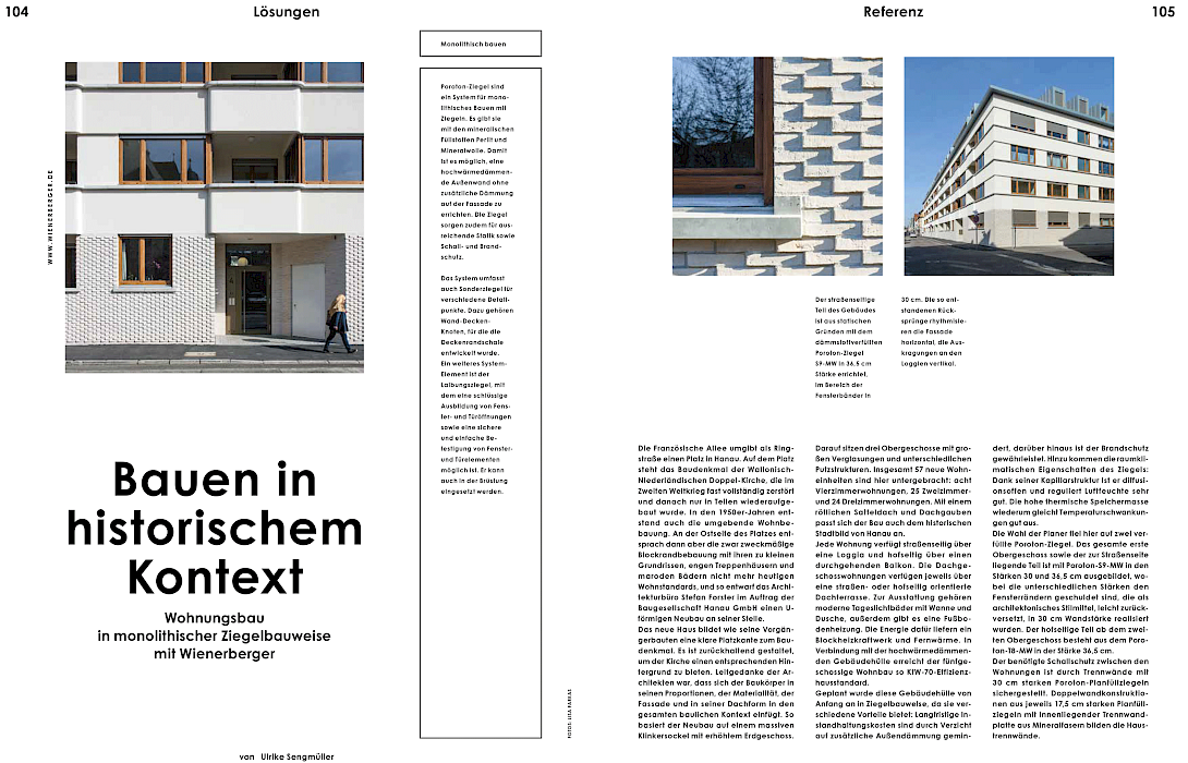 In der Rubrik „Lösungen“ zeigt die aktuelle Ausgabe des Architektur-Fachmagazins Baumeister am Beispiel des Neubaus Französische Allee in Hanau, wie Wohnungsbau in monolithischer Ziegelbauweise aussehen kann. In Partnerschaft mit Wienerberger.