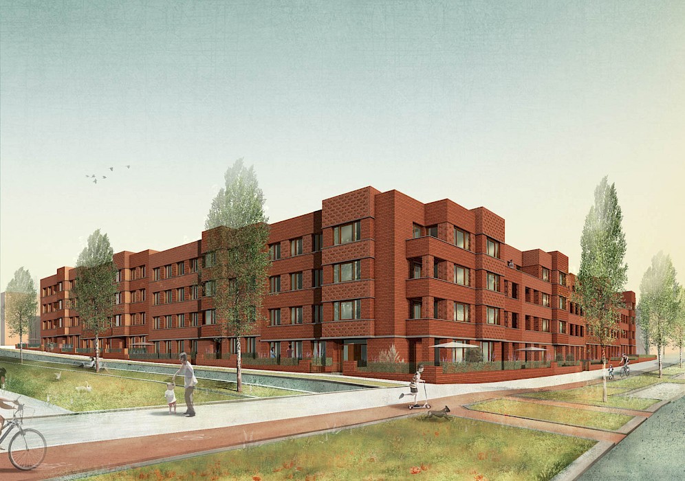 Im Hannoveraner Neubaugebiet Kronsberg-Süd, unmittelbar westlich an das EXPO 2000-Gelände anschließend, realisiert Stefan Forster Architekten eine zweiteilige Wohnbebauung mit insgesamt 110 Wohneinheiten. 98 Wohnungen sind in einer U-förmigen Blockrandbebauung entlang von drei Seiten des Straßenblocks untergebracht, ergänzt um eine Reihe von zwölf Townhouses an der Ostseite des Blocks. Durch den Abstand zwischen Geschosswohnungsbau und Townhouses entsteht eine Verbindung von Hof und Straße.