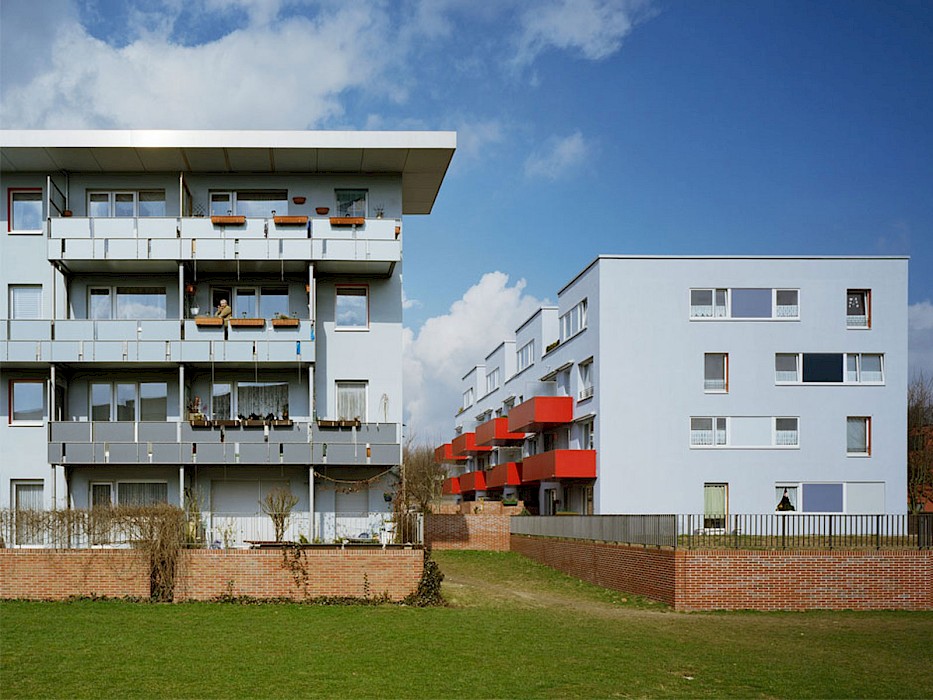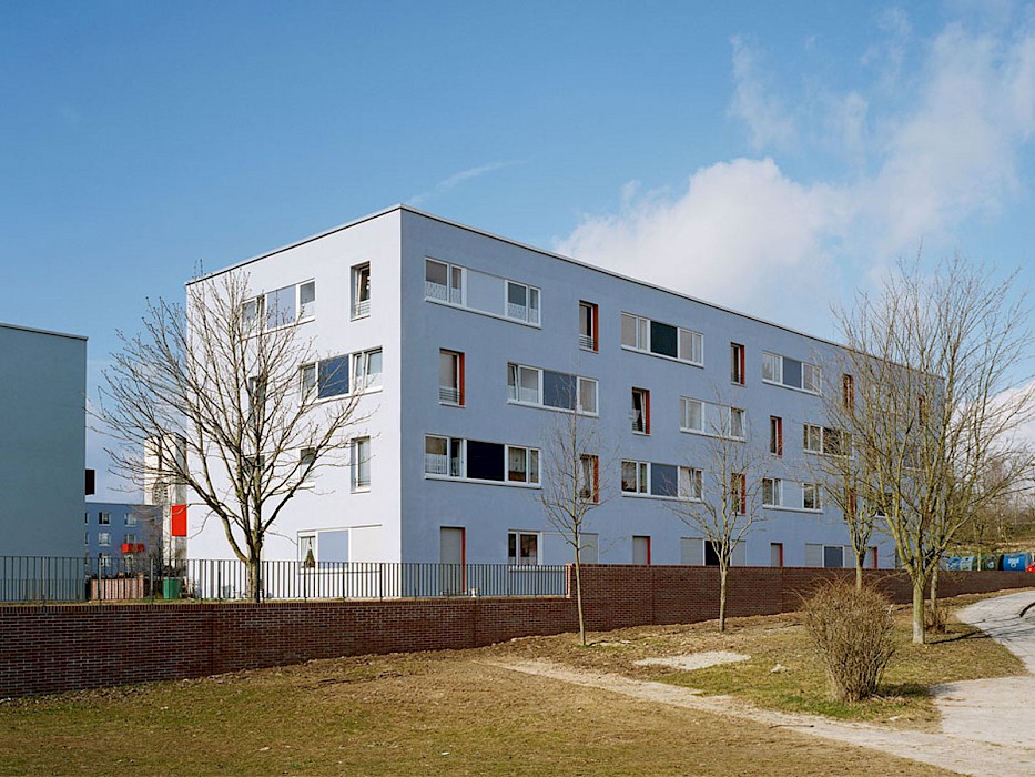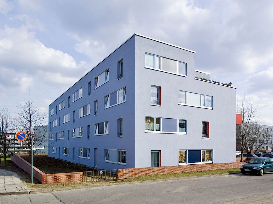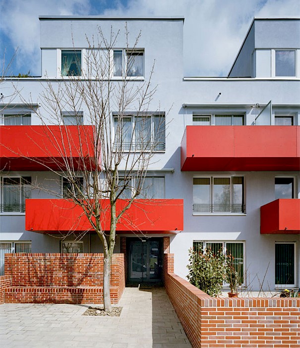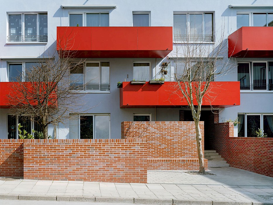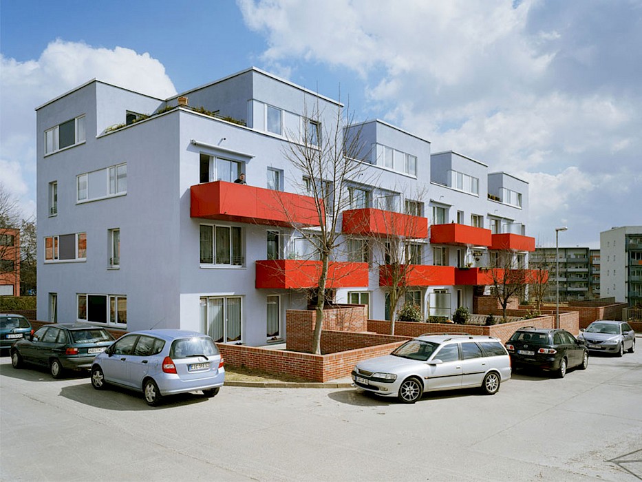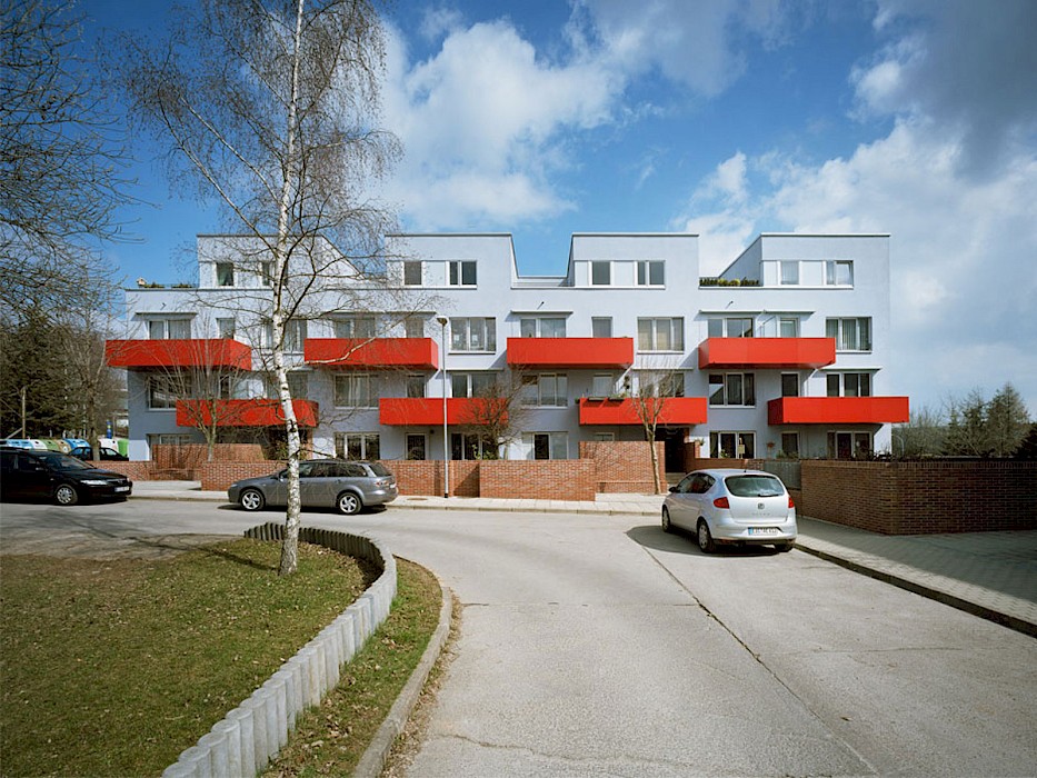 Der relativ kompakte Plattenbau mit der vergleichsweise geringen Anzahl von 20 Wohnungen wurde um zwei Geschosse zurückgebaut und mit einem umlaufenden Mauerwerkssockel versehen. Aus dem Obergeschoss ausgeschnittene Dachterrassen bieten großzügige Freiräume und schließen das Gebäude nach oben plastisch ab. Die markanten, in leuchtendem rot gehaltenen, länglichen Balkone akzentuieren die Fassade. Bestimmend für den Entwurf sind einerseits die Entwicklung von Freiflächen und Außenräumen für die Bewohner, sei es durch Privatgärten im Erdgeschoss, durch Balkone in den Mittelgeschossen oder durch Dachterrassen, sowie andererseits das Motiv der klassischen Dreiteilung der Fassade in Sockel, Schaft und oberen Abschluss.