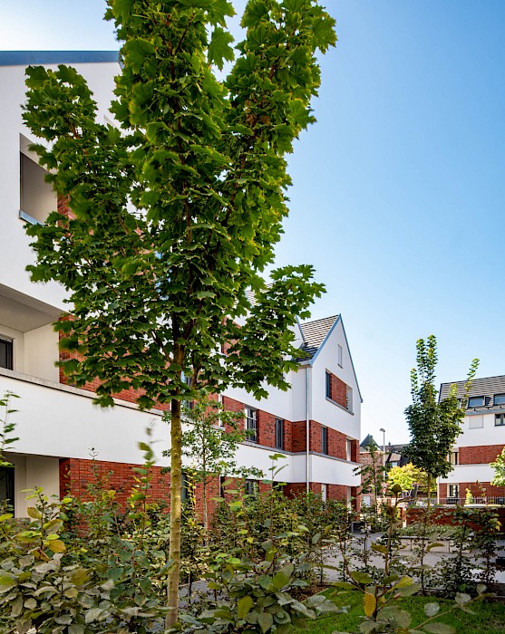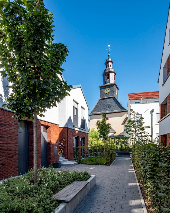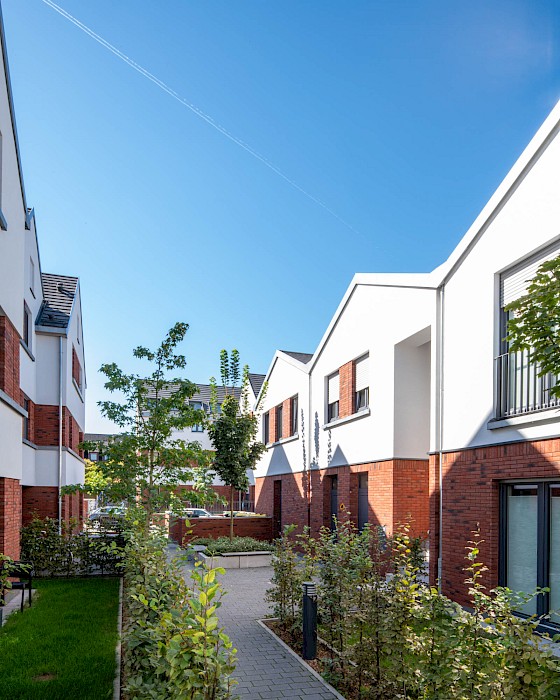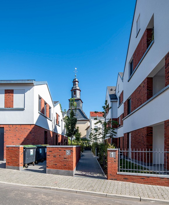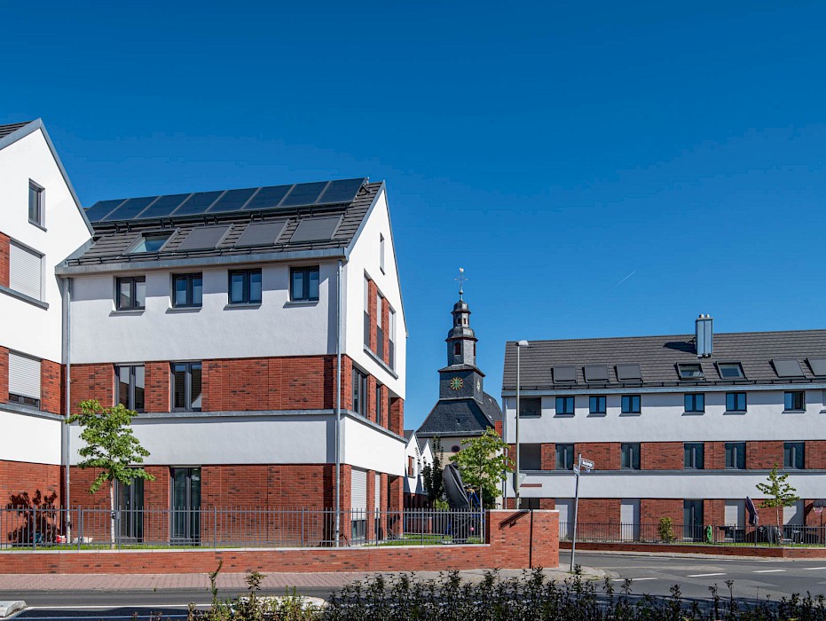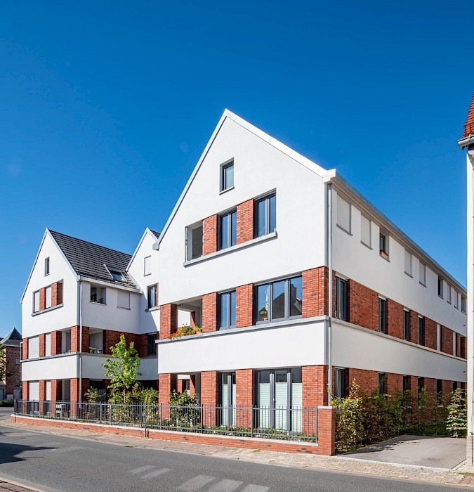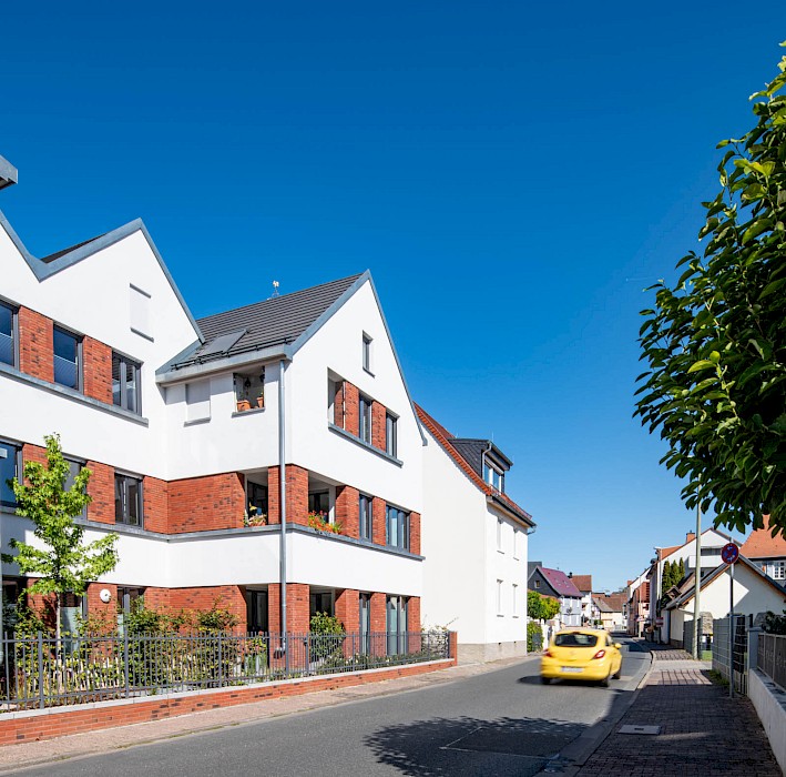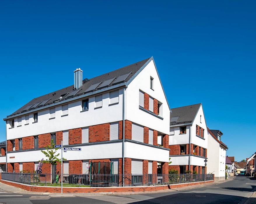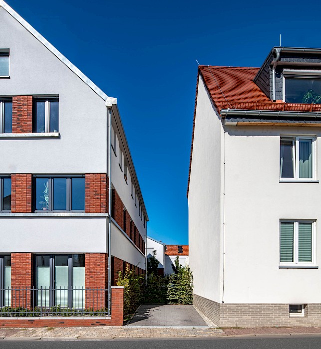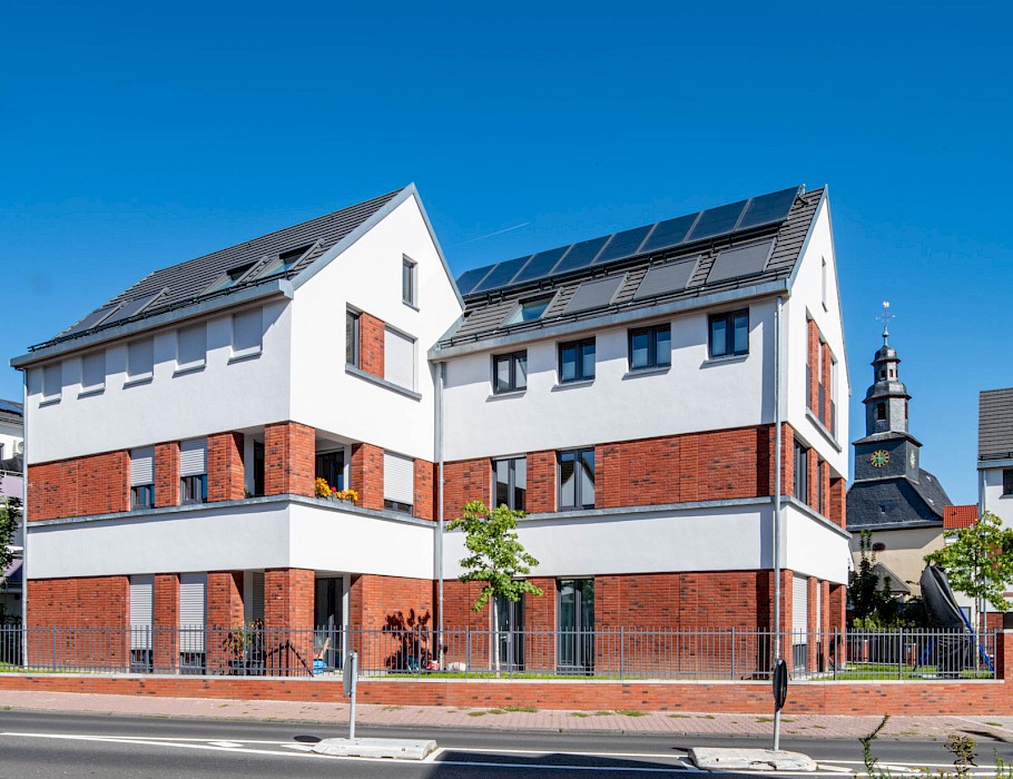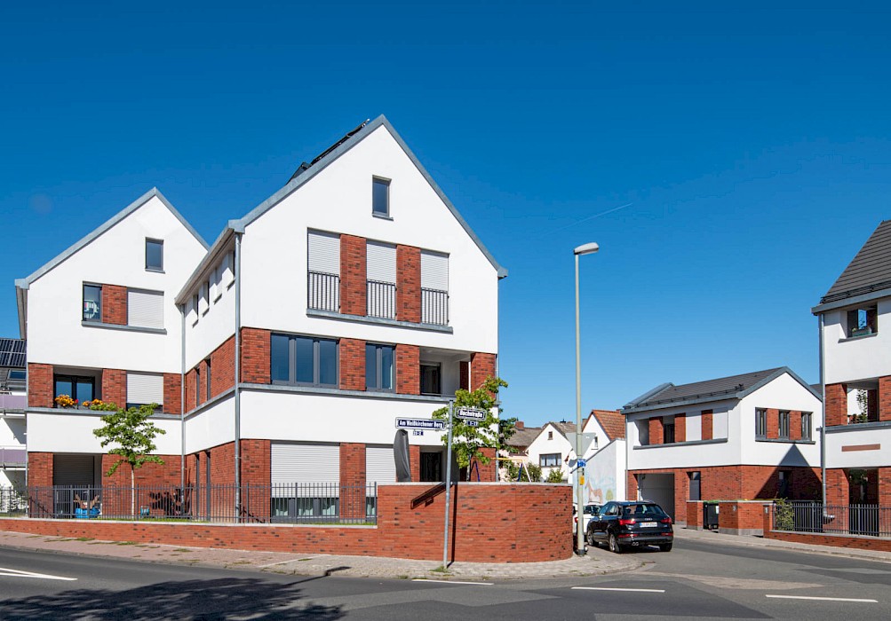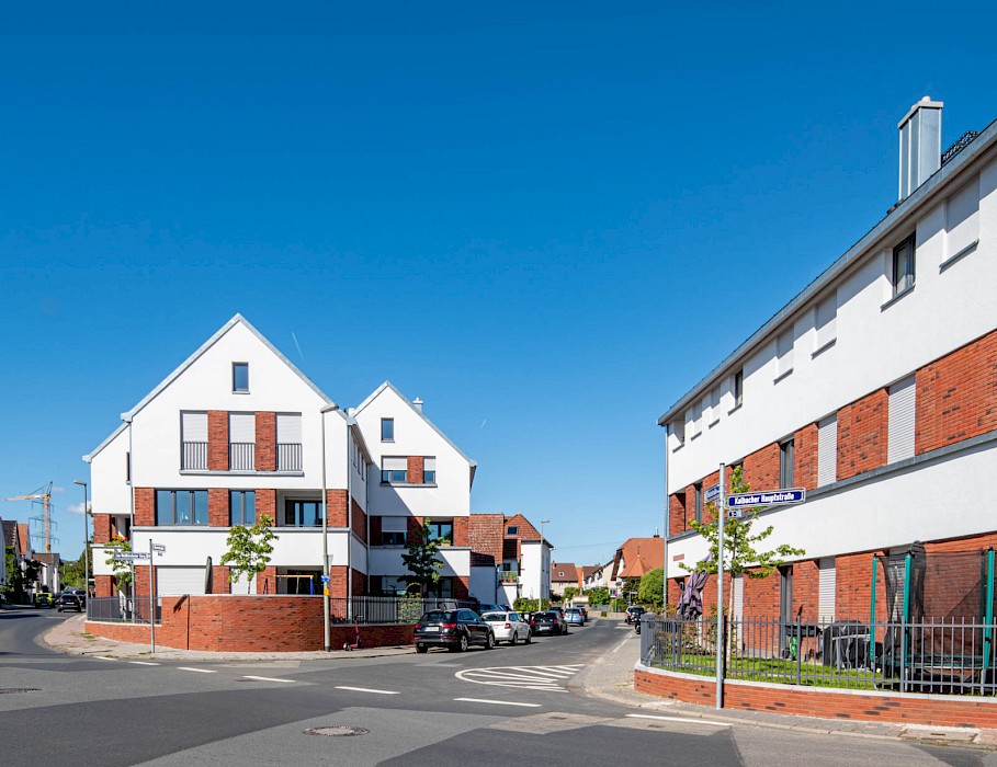 Auch die abwechselnd in rotem Klinker und hellen Putzflächen gestalteten Fassaden sind als Referenz an den Ort zu verstehen. Der Gedanke des verbindenden Klinkersockels wird in der Einfriedung der Vorgärten fortgesetzt. Durch die versetzte Anordnung der Häuser an der Ostseite der Bachstraße entsteht erstmals eine direkte Blickbeziehung zur Kirche St. Laurentius. Die Wohnhäuser in Kalbach führen Prinzipien fort, die bereits 2017 beim Projekt „Eulengasse“ entwickelt wurden, und versuchen, die tradierte Identität des Ortes zu stärken. Insgesamt sind 22 Mietwohnungen in energiesparender, nachhaltiger Ziegelbauweise entstanden.