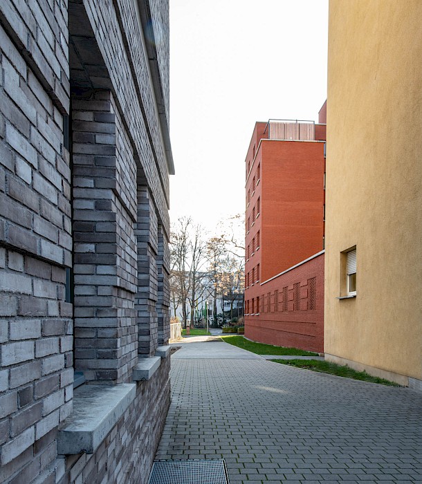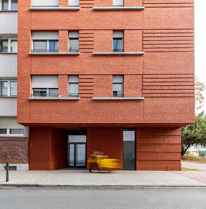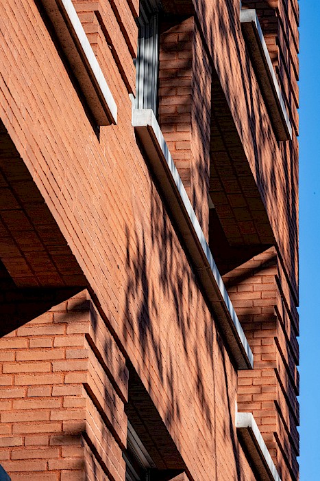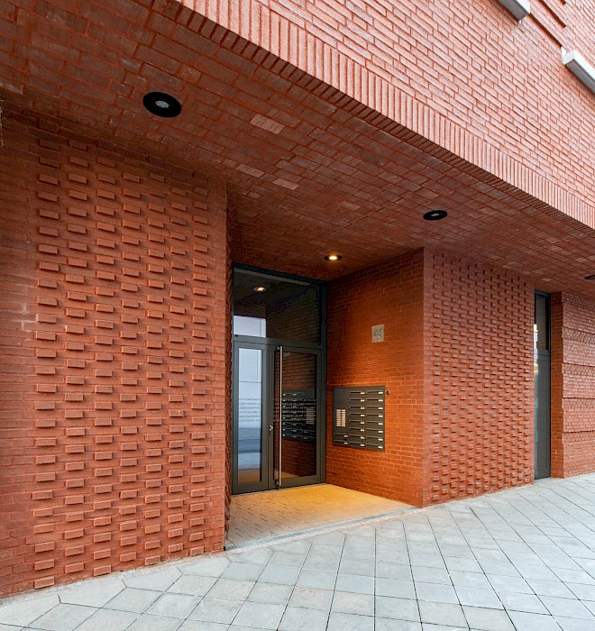 Die markante Fassade aus leuchtendrotem Klinkermauerwerk wird mit einer Rollschicht zwischen den Fenstern horizontal gegliedert und durch die zu Gesimsen verbundenen Fensterbänke zusätzlich plastisch ausformuliert. Ein 1,20 Meter hohes Hochparterre über dem befensterten Souterrain schützt die Privatheit der beiden Erdgeschosswohnungen. Die Obergeschosse sind bis zum fünften OG als 3-Spänner, darüber als 2-Spänner und im Staffelgeschoss als Penthouse organisiert. Das Wohnhaus Lameygarten komplettiert den Wohnungsbestand der lokalen Genossenschaft Spar und Bau, deren Geschäftsstelle mit Wohnhaus bereits 2011 an der Westseite desselben Straßenblocks von Stefan Forster Architekten realisiert wurde.