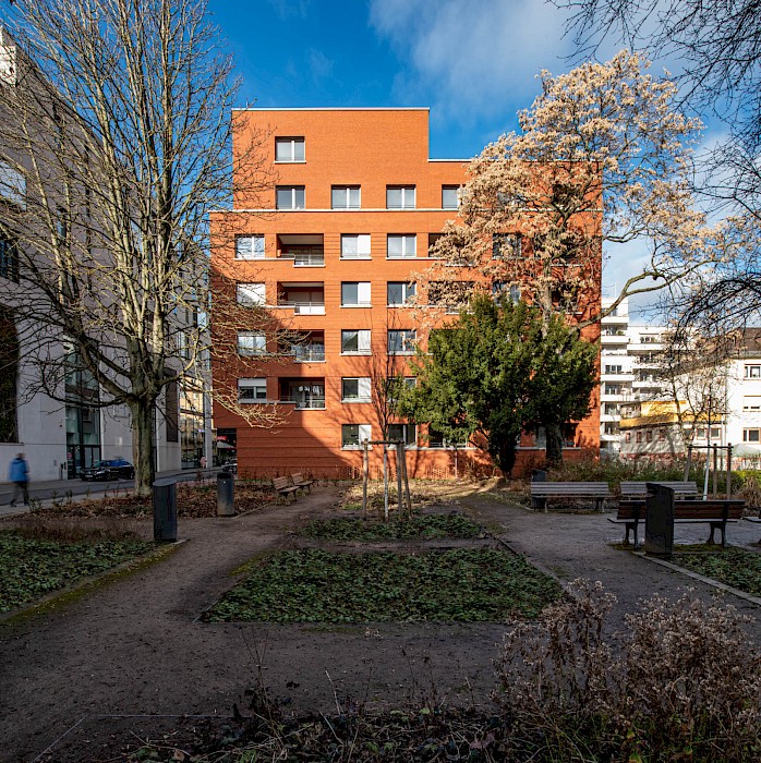 Der Lameygarten ist eine aus dem 19. Jahrhundert stammende Parkanlage, die im Innenbereich des länglichen Straßenblocks R7 im Zentrum von Mannheim liegt. An der unbebaut gebliebenen Südwestecke des Parks führt der siebengeschossige Neubau den Blockrand entlang der Straße fort und markiert so den Eingang zur Grünanlage; nach Innen ersetzt er einen zweigeschossigen Riegelbau und bildet eine klare Raumkante zum Grünraum. Mit sechs Geschossen und dem zurückversetzten Staffelgeschoss orientiert sich das Wohnhaus an den Neubauten im Umfeld des Lameygartens, während der über die ersten vier Obergeschosse auskragende Erker Bezug zu den Dimensionen der unmittelbaren Nachbarhäuser aufnimmt.