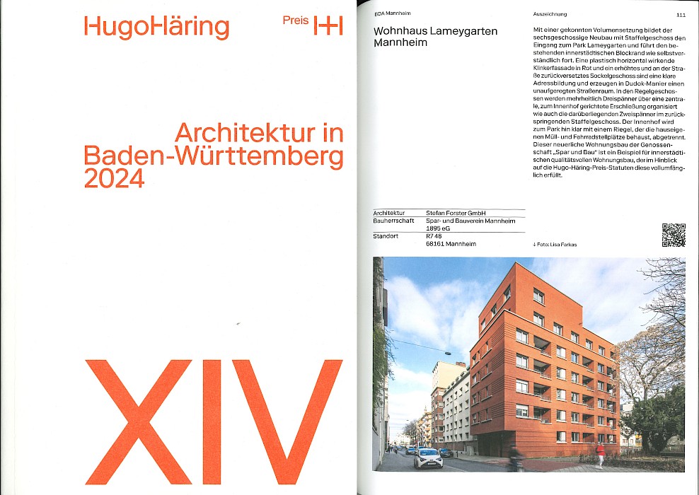 Der Bund Deutscher Architektinnen und Architekten BDA präsentiert in der aktuellen Publikation „Hugo-Häring-Preis – Architektur in Baden-Württemberg“ unser Wohnprojekt Lameygarten in Mannheim. Wir freuen uns, dass die BDA Gruppe unser Appartementhaus Lameygarten mit der renommierten Hugo-Häring-Auszeichnung, dem „Kleinen Hugo“, gewürdigt hat.