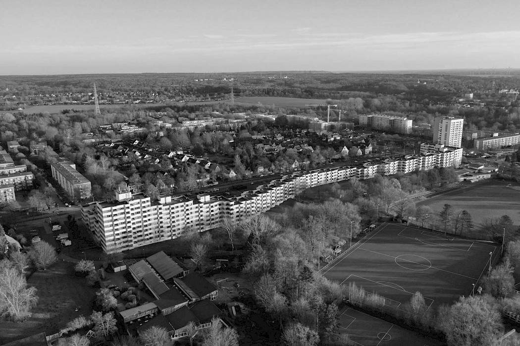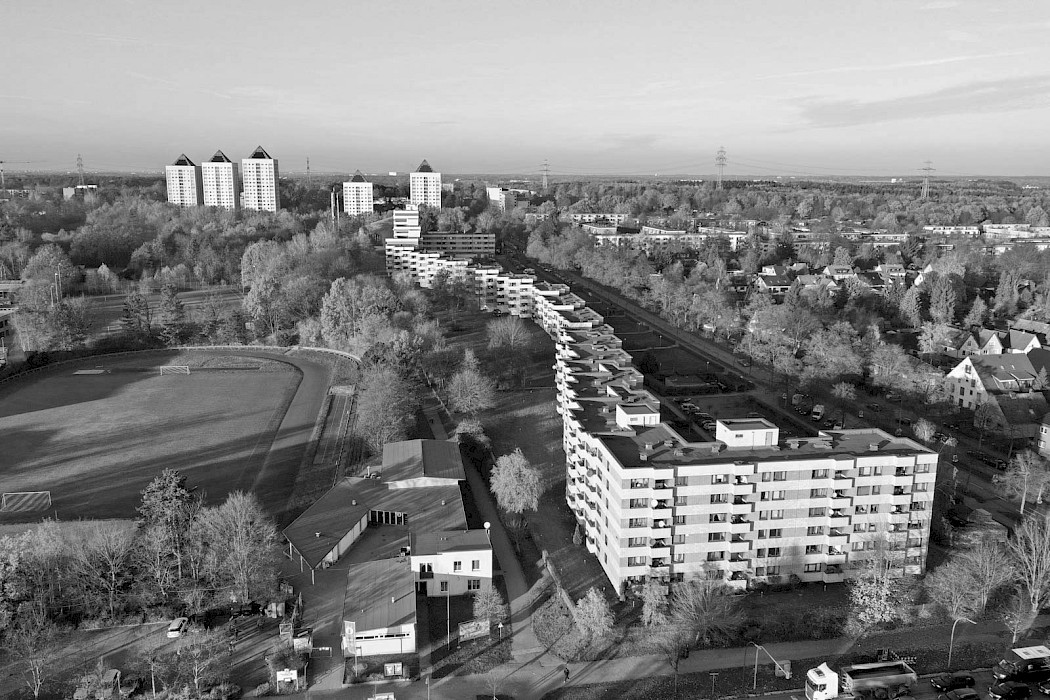 Im Südosten Hamburgs liegt die in den 1960er-Jahren geplante Großsiedlung Lohbrügge-Ost. Als typische Trabantenstadt war sie einst dem Ideal einer modernen Gartenstadt verpflichtet: bis zu 17-geschossige Hochhäuser, Zeilenbauten und Reihen- sowie freistehende Einfamilienhäuser sind hier in Grünräumen anzutreffen. So auch der „Lindwurm“, der sich zwischen zwei Flügelbauten im Norden und Süden 400 Meter lang in einer Wellenform entlang der Straße Röpraredder aufspannt (und damit zu den längsten Wohnhäusern Deutschlands zählt). In 3- bis 9-geschossigen Einzelhäusern beherbergt er insgesamt 258 Wohnungen. Im Auftrag der d.i.i. Gruppe wird das Lindwurmareal umfangreich revitalisiert, der Bestand und die Freiflächen saniert sowie nachverdichtet.