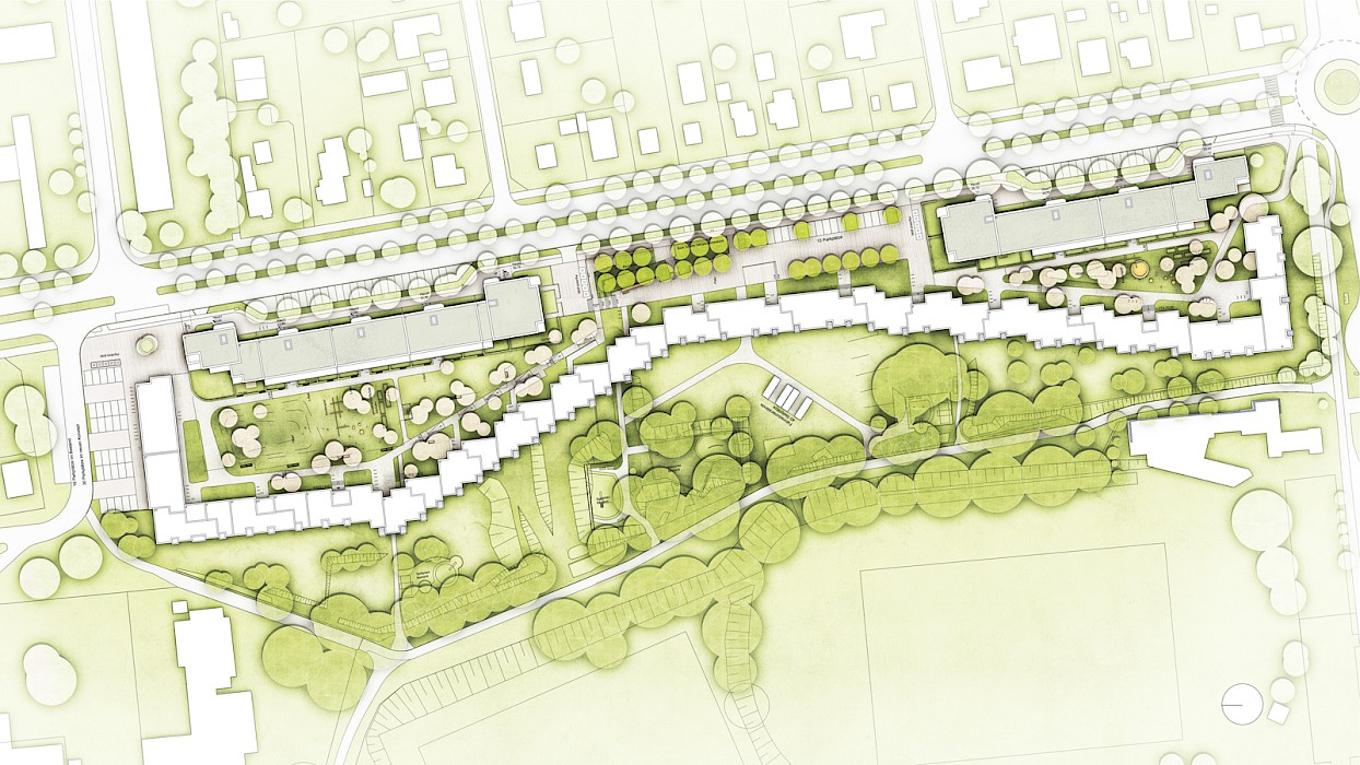 Der neue Lindwurm, eine Wohnstruktur im Grünen als nachhaltige Wohnform umspült von differenzierten Außenräumen.
