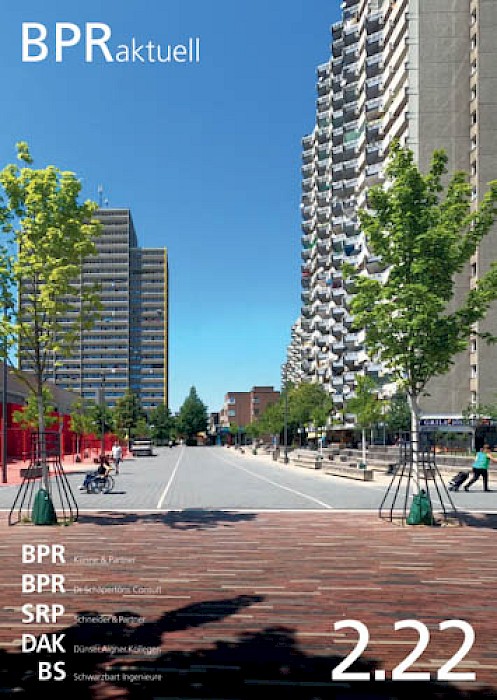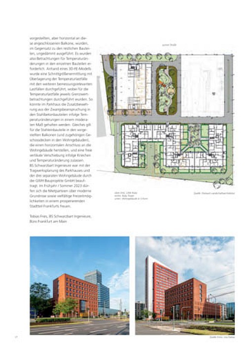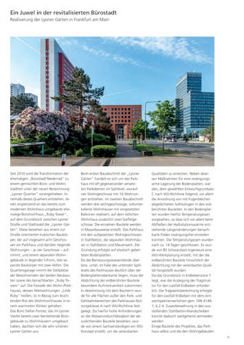 „Ein Juwel in der revitalisierten Bürostadt“: In einem Fachbeitrag für das Unternehmensmagazin der BPR-Gruppe beschäftigt sich Tobias Fries (BS Schwarzbart Ingenieure) mit der Tragswerksplanung für den ersten Bauabschnitt des Projekts Lyoner Straße. Die Quartiersgarage mit kombinierter Wohnnutzung wird im zweiten Abschnitt um einen dahinterliegenden, S-förmigen Wohnbau ergänzt.