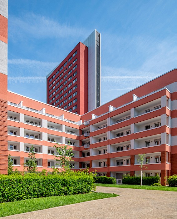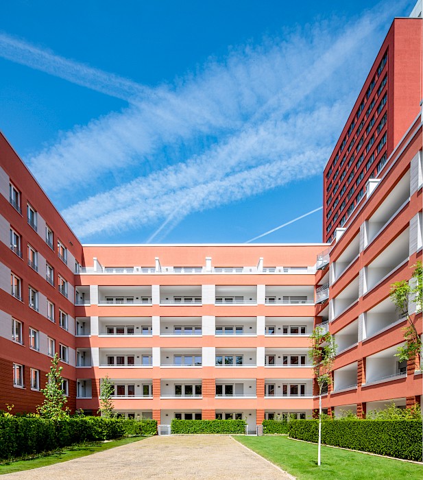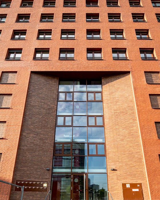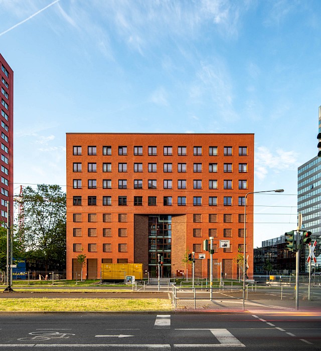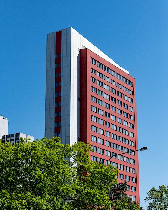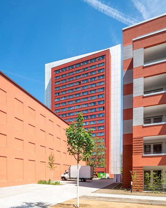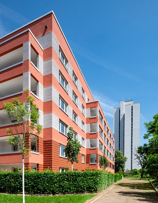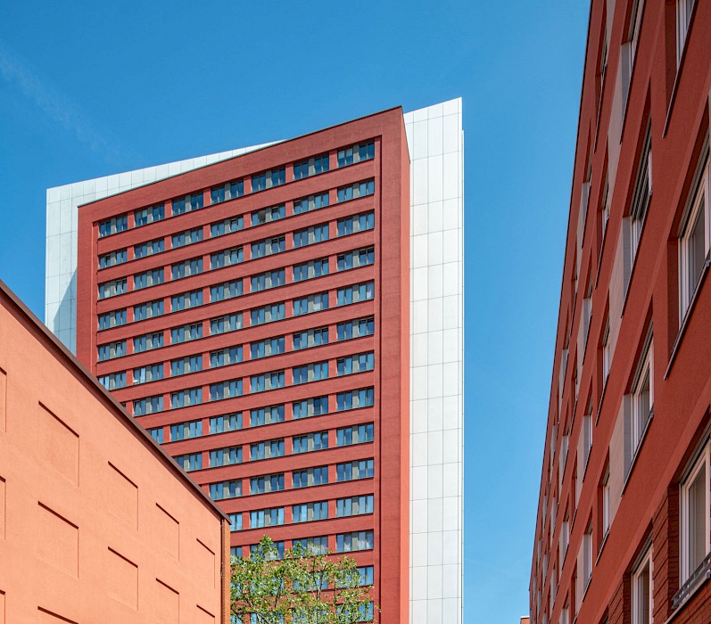 Die Grundfigur des sanierten Hochhaus-Baukörpers – ein keilförmiger, 19-geschossiger Kern, der von einem 18-geschossigen Kubus ummantelt wird – bleibt erhalten. Die neue Fassade führt die ursprüngliche architektonische Idee der überstehenden Scheibe in einem rechteckigen Baukörper fort. Die für den Bürobau charakteristische Curtain-Wall-Fassade wurde durch eine Lochfassade mit liegenden Fensterformaten und durchgehenden Brüstungsgesimsen ersetzt. Der warme, rote Farbton der Hauptfassade betont zusätzlich die neue Funktion des Gebäudes als Wohnhaus und schafft eine neue Identität. Das Bestandsgebäude wurde, dem Entwurf folgend, vollständig entkernt und alle nichttragenden Wände zurückgebaut. Insgesamt entstanden 150 neue Wohnungen.