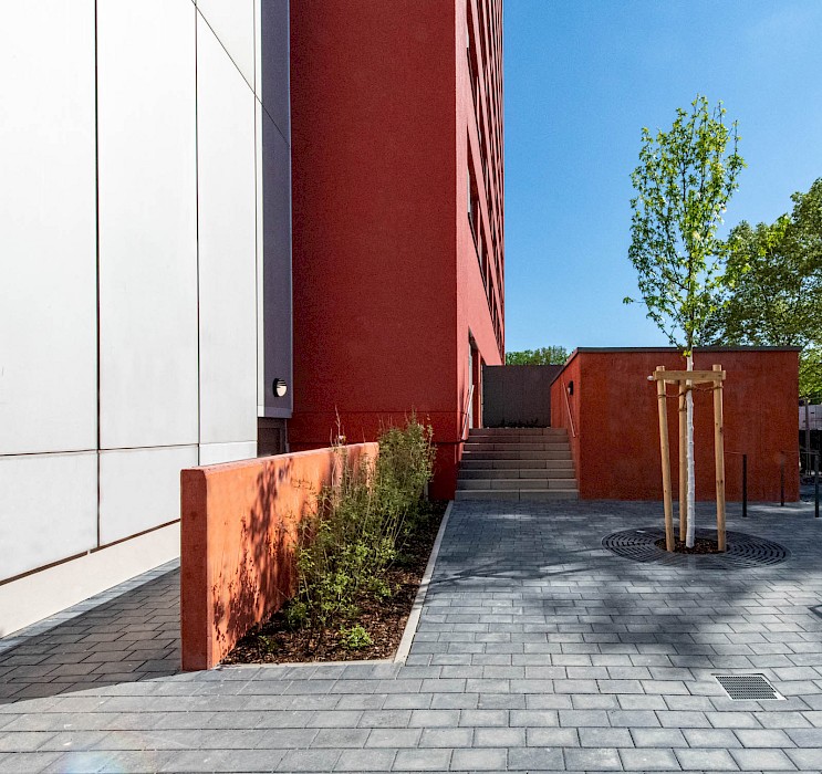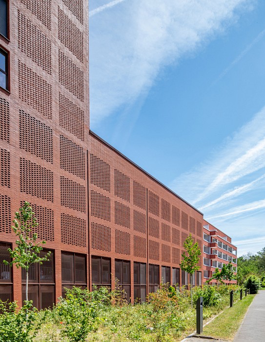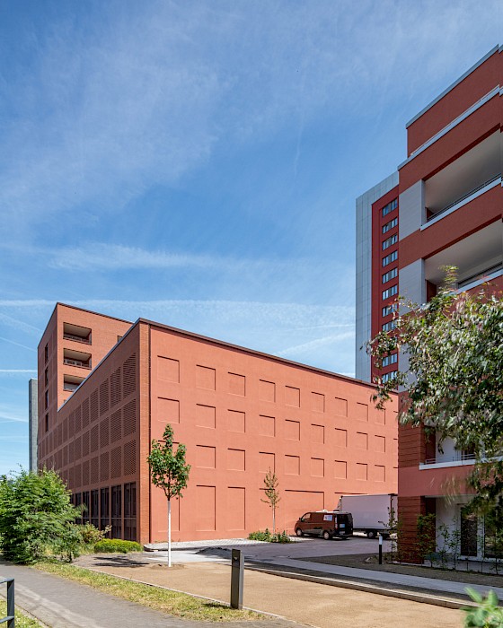Der Wohn- und Parkhaus kombinierende Neubau polarisiert durch seine streng rationalistisch aufgebaute, an Aldo Rossi erinnernde Fassade in warmrotem Klinker. Es entstehen unverkennbare Bezüge zum leuchtenden Rot des Hochhauses. Die ersten vier Obergeschosse sowie zwei Untergeschosse fassen 230 Stellplätze und bilden zugleich den Sockel für die Wohnbebauung. Die Quartiersgarage nimmt somit die Stellplätze der Bewohner der Neubauten sowie des sanierten Hochhauses auf. Auf ca. 1/3 der Grundfläche des Parkhauses finden sich auf weiteren vier Geschossen insgesamt 16 Wohneinheiten.