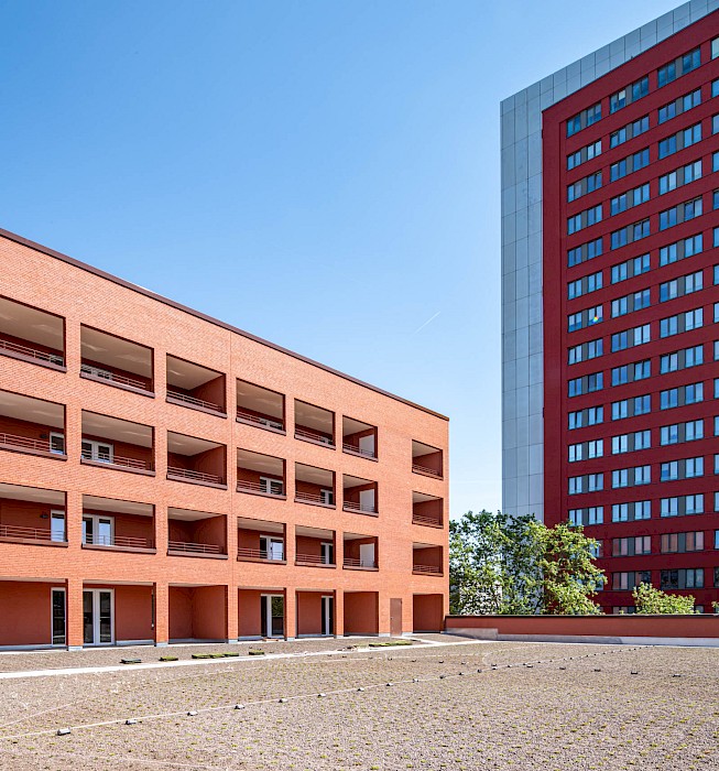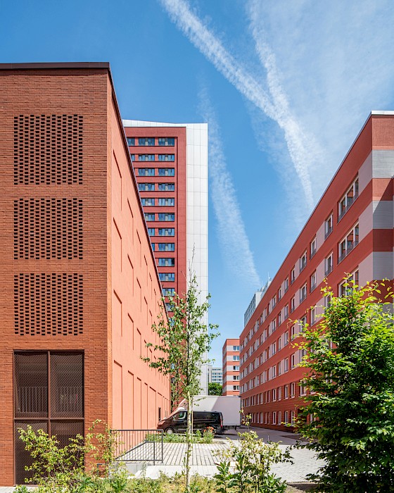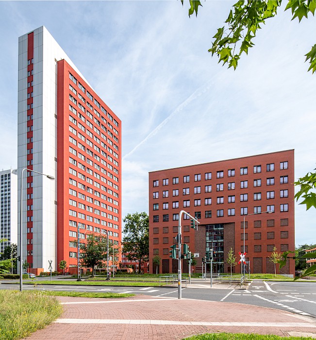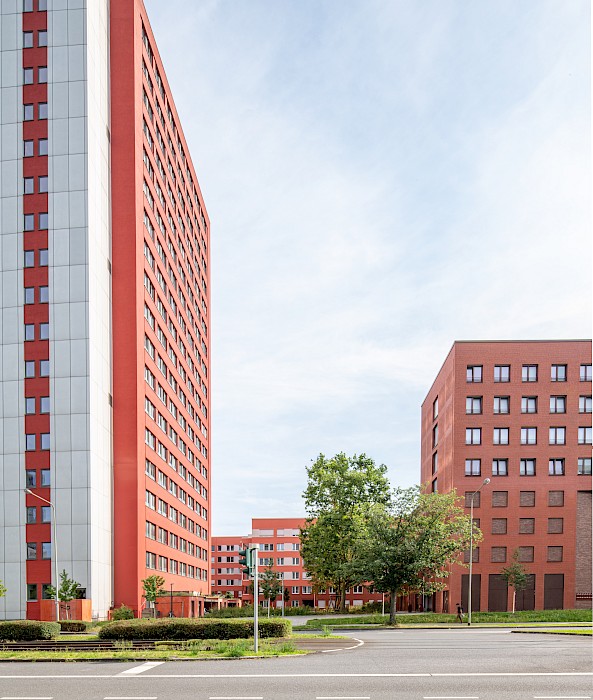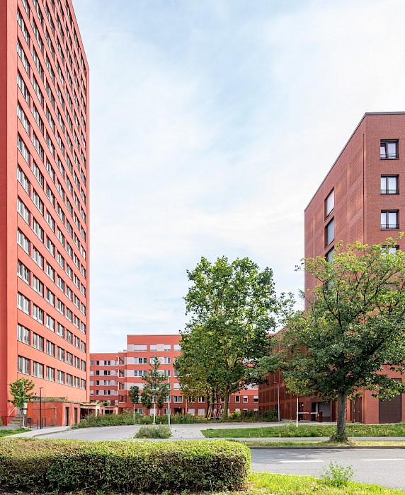 „Neben der sanierten und zum Wohngebäude umgenutzten Bürohochhausscheibe sind nun eine Wohnschlange mit zwei nach einer Seite offenen Innenhöfen sowie ein Parkhaus mit Wohnnutzung entstanden. Diese drei Baukörper stehen in einem räumlichen und architektonischen Bezug zueinander und bilden das neue Quartier mit insgesamt 150 Wohnungen.“