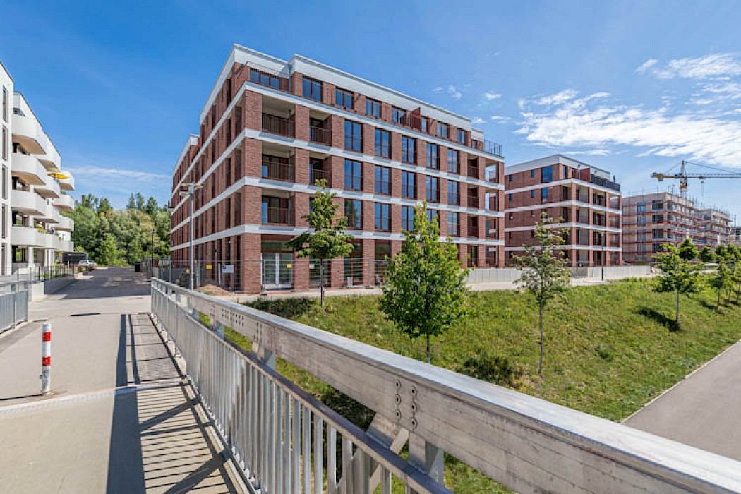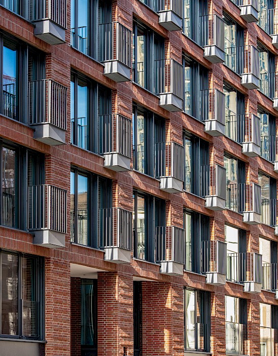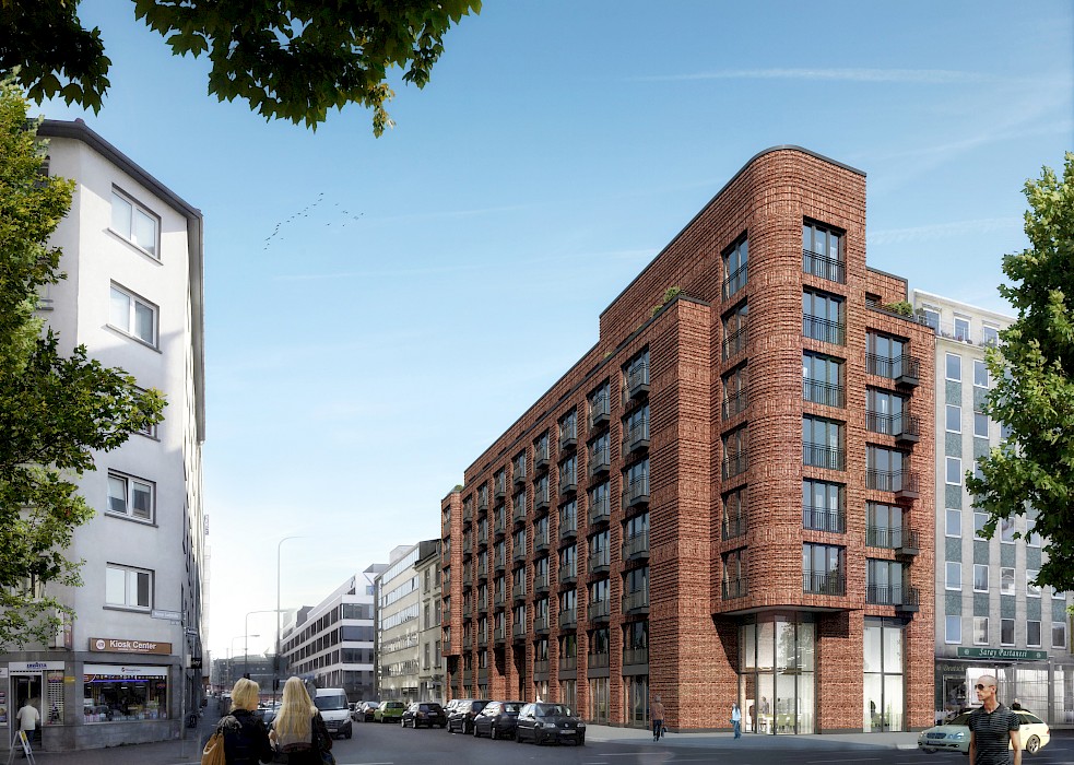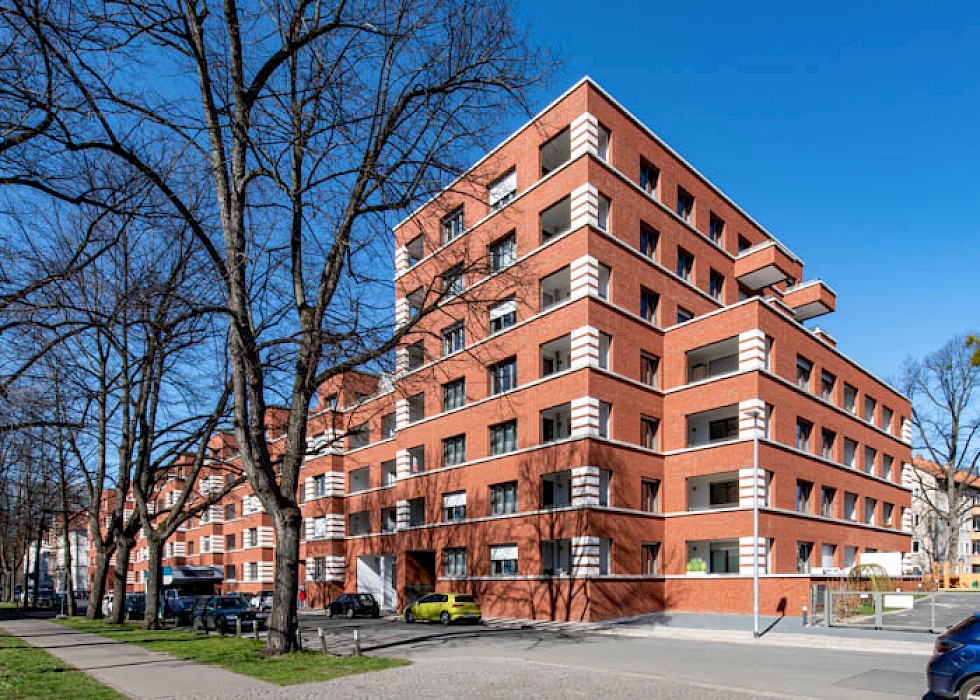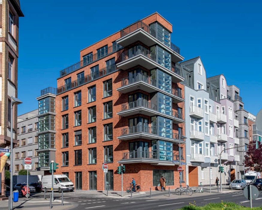 Der Baukörper des Neubaus nimmt die Dimensionen der Nachbarbebauung mit ihrer Traufhöhe auf und leistet so einen Beitrag zur Stadtreparatur. Ein Gedanke, den die warmtonige, reliefartig gestaltete Klinkerfassade mit Bezügen auf die europäische Baugeschichte weiterführt. Die Ecksituation – und damit der Bezug zum gegenüberliegenden Güterplatz – wird durch ein überhöhtes Erkermotiv betont. Im Erdgeschoss befinden sich zwei Ladeneinheiten, in den Geschossen darüber insgesamt 117 Appartements.