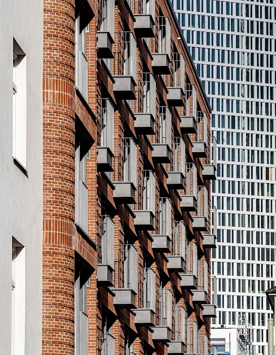 Zwischen alter und neuer Welt: Der Frankfurter Güterplatz verbindet die Bestandsviertel Gallus und Bahnhofsviertel mit dem neuen Europaviertel und der Messe. Auf der einen Seite kleinteilige Blockrandbebauung und multikultureller Alltag, auf der anderen hypermoderne Wohn- und Bürotürme neben dem Einkaufszentrum Skyline Plaza. Inmitten dieser Situation präsentiert sich das Wohnhaus Mainzer Landstraße als markanter Ruhepunkt in exponierter Lage. Es ersetzt ein zuletzt leerstehendes, nicht mehr sanierungsfähiges Bürogebäude der Concordia-Versicherung.