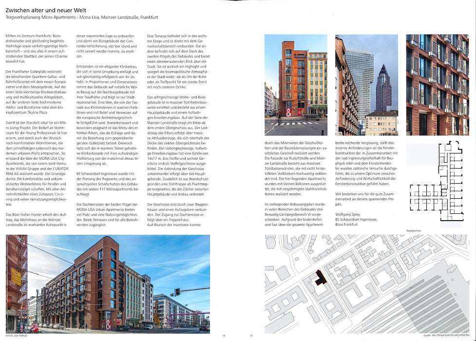 In einem Fachbeitrag für das Unternehmensmagazin der BPR-Gruppe beschäftigt sich Wolfgang Sprey (BS Schwarzbart Ingenieure) mit unserem Projekt Mainzer Landstraße in Frankfurt am Main. Der Klinkerbau ersetzt ein leerstehendes Bürogebäude der Concordia-Versicherung und bietet Raum für 117 Mikroappartements und Wohnungen. Zusätzlich beherbergt das Erdgeschoss zwei Einheiten für Gastronomie und Gewerbe.