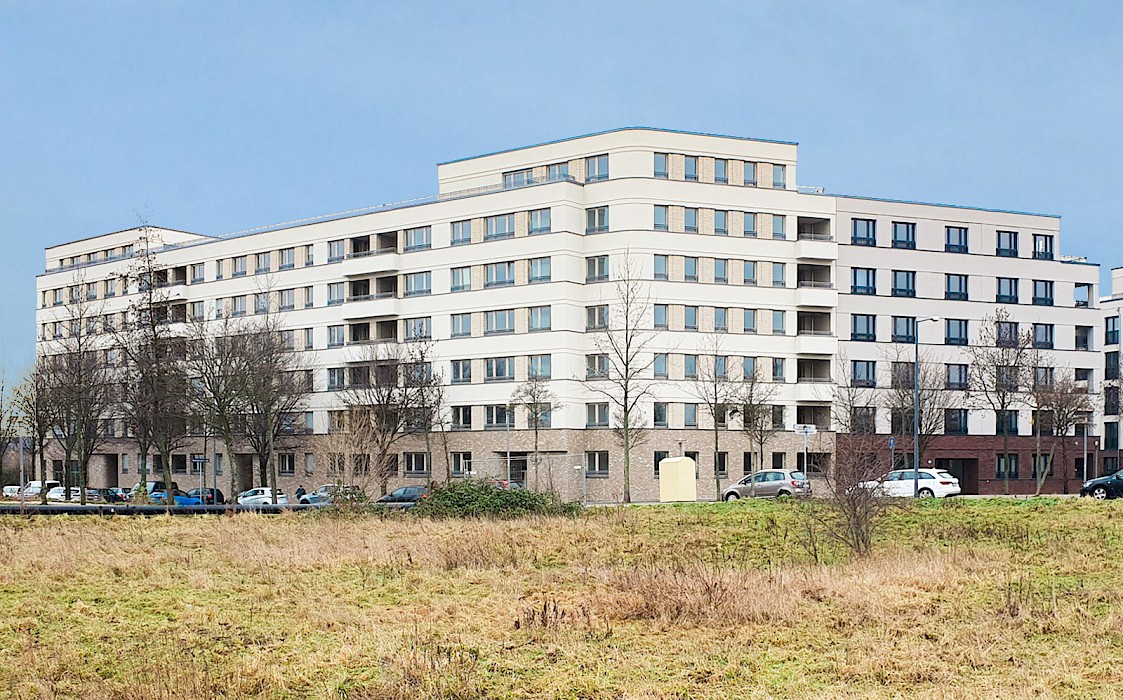 Im Westen des Areals planen Stefan Forster Architekten – als eines von drei Architekturbüros in diesem Bereich – ein Wohnhaus mit 68 Wohneinheiten. Der Neubau bildet den Eingang zum neuen Quartier und definiert die Ecken des Blockrands. Im Innenbereich entstehen begrünte Höfe zur gemeinschaftlichen Benutzung durch die Bewohner. Der Entwurf sieht einen so unprätentiösen wie markanten Baukörper vor, der sich mit seinem Sockel und den Fenstergewänden aus hellem Elbstandstein auf die lokale Bautradition der Stadt Dresden bezieht.