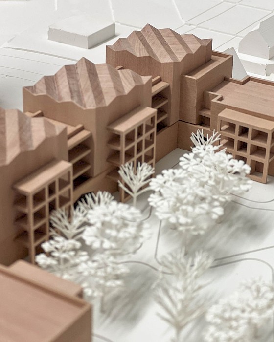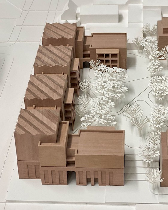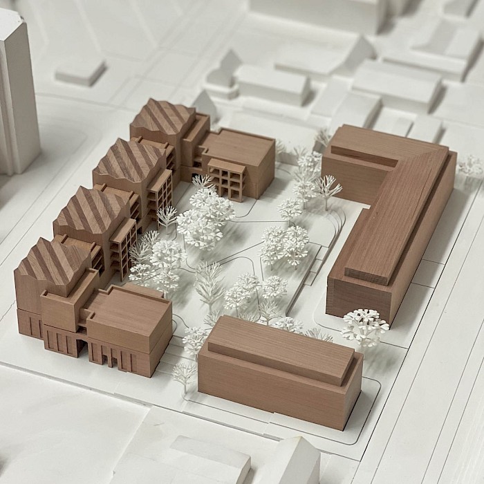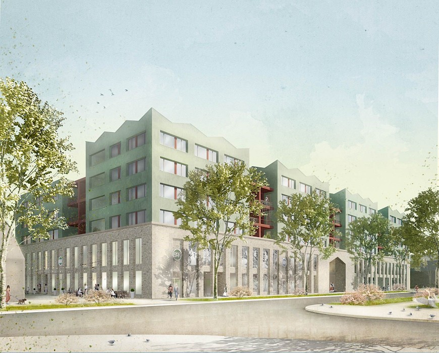 Der Baukörper reagiert städtebaulich auf die sehr heterogene Umgebung und definiert den Straßenraum im Sinne einer Blockrandbebauung neu. Betonte Kopfbauten mit eingeschnittenen Loggien gliedern das Volumen und geben der Straße einen Rhythmus. Die Fassadengestaltung macht die Nutzungsmischung ablesbar: Ein wertiger, zweigeschossiger Sockel aus beigefarbenen Klinkersteinen und schmalen, stehenden Fensterformaten fasst die gewerblichen Nutzungen zusammen. Die darüberliegenden Wohngeschosse erhalten einen grünen Kammputz und liegende Fenster. Die gezackte Dachkante nimmt einerseits Bezug zu den geneigten Dächern der Umgebung auf und verbirgt zum anderen die dahinterliegende Photovoltaikanlage. Ein markanter, zweigeschossiger Durchgang verbindet Straße und Hof und verstärkt die Adressbildung.