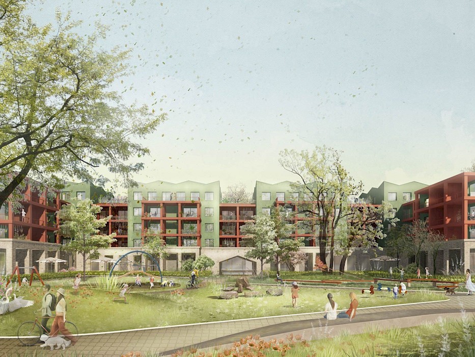 Ein weiterer Schwerpunkt des Entwurfs liegt auf der Gestaltung des aufwändig begrünten Innenhofs. Die Freiraumgestaltung zeichnet sich durch großzügige, zusammenhängende Grünflächen in Verbindung mit thematischen „Inseln“ für Spiel und Fitness aus. Darüber hinaus leisten begrünte Loggien und Dachgärten sowie die Regenwasser-Rückgewinnung einen Beitrag zur Verbesserung des Mikroklimas. Aussparungen in der Tiefgarage ermöglichen die Bepflanzung mit tiefwurzelnden Bäumen und eine teilweise Entsiegelung des Bodens im Sinne der Schwammstadt. Die auf den Dächern angeordneten Photovoltaikanlagen ermöglichen eine klimaneutrale Energieversorgung. Sämtliche Wohnungen verfügen über großzügige Freibereiche in Form von Privatgärten, Loggien und Dachterrassen.