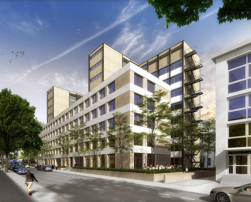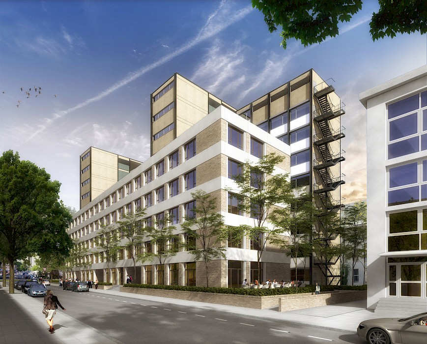 Grundgedanke des Entwurfs war neben der denkmalgerechten Sanierung und Umnutzung des Altbaus die Errichtung eines entlang der Gräfstraße verlaufenden Ergänzungsbaus, der durch die Übernahme der Bauflucht und Traufhöhe des gründerzeitlichen Blockrands eine bewusste Korrektur des Städtebaus der Nachkriegsmoderne vornimmt. Der neungeschossige Altbau überragt nun den mit Klinkern und Betonelementen zurückhaltend gestalteten Neubau um vier Geschosse und bleibt dahinter sichtbar. Beide Gebäudeteile sind durch die bestehenden Treppenhaustürme miteinander verbunden und werden über diese erschlossen. Aufgrund von massiven bauphysikalischen und statischen Mängeln konnte die charakteristische Rasterfassade nicht im Original erhalten werden, sondern wurde bis ins Detail sorgfältig rekonstruiert. Auch die Variation der Fensteraufteilung, die von Ferdinand Kramer abwechselnd zwei- und dreiteilig angelegt war, wurde beibehalten. So präsentiert sich die Parkseite des Philosophicums heute wieder im Zustand und der Anmutung der 1960er-Jahre – eine Qualität, die sich im Inneren mit handgemalten weißen Marmorierungen der Treppenstufen, dem Farbkonzept der Türen und den originalen Handläufen und Glasbausteinen fortsetzt.