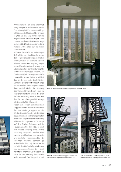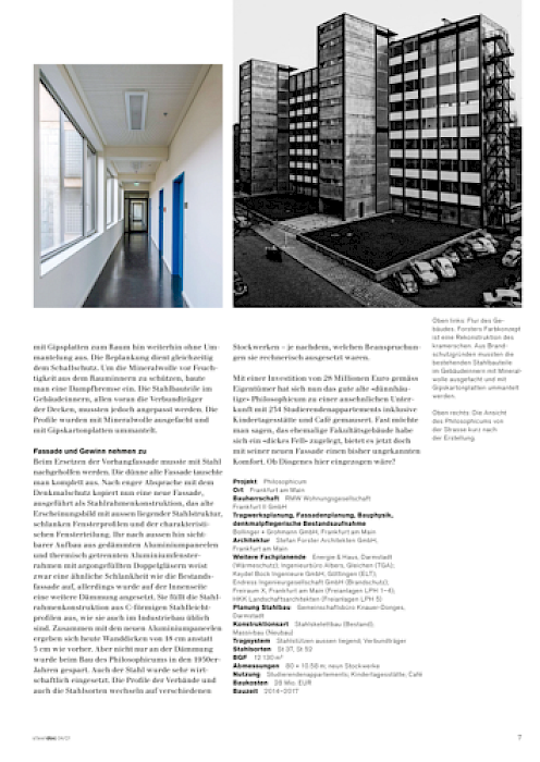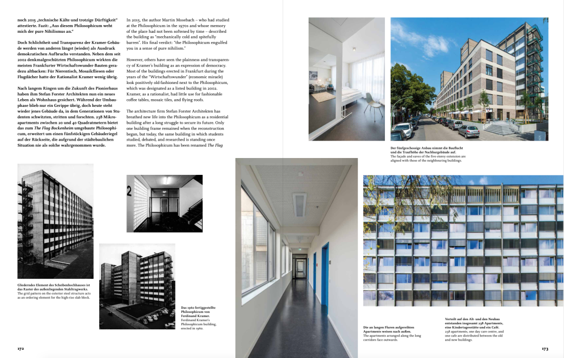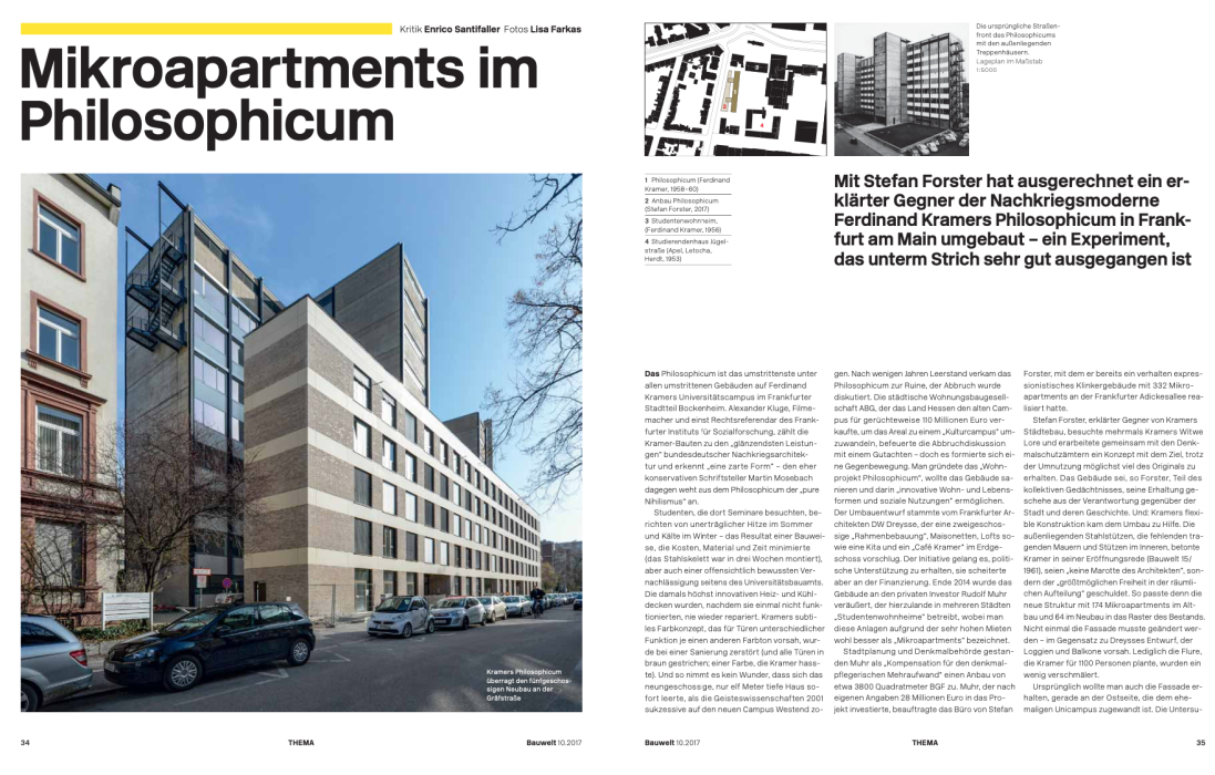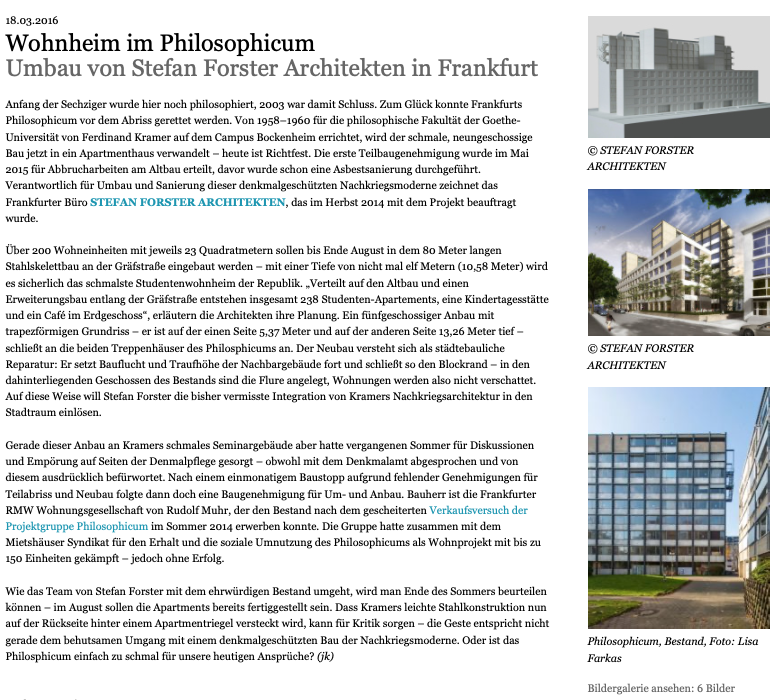 In einem ausführlichen Fachbericht befasst sich die Zeitschrift des BDB – Bund Deutscher Baumeister mit der Sanierung und Erweiterung des Philosophicums in Frankfurt. Das ehemalige Universitätsgebäude wurde von 2014–2017 von Stefan Forster Architekten zu einem Studierendenwohnheim transformiert.