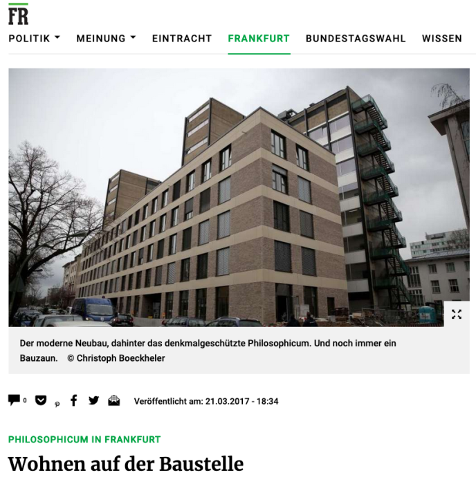 Artikel: „Philosophicum in Frankfurt – Wohnen auf der Baustelle“, Frankfurter Rundschau