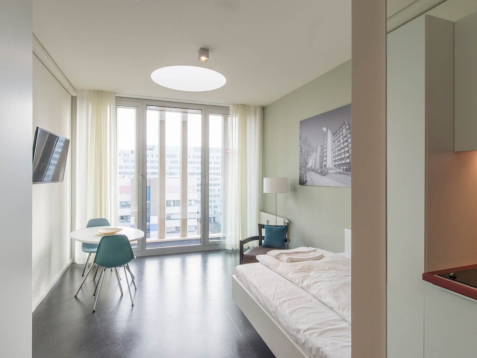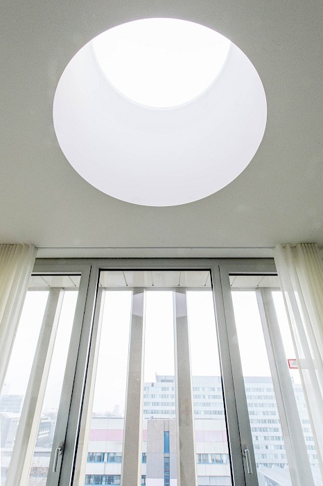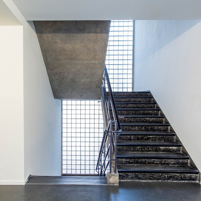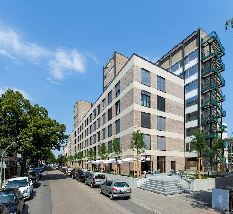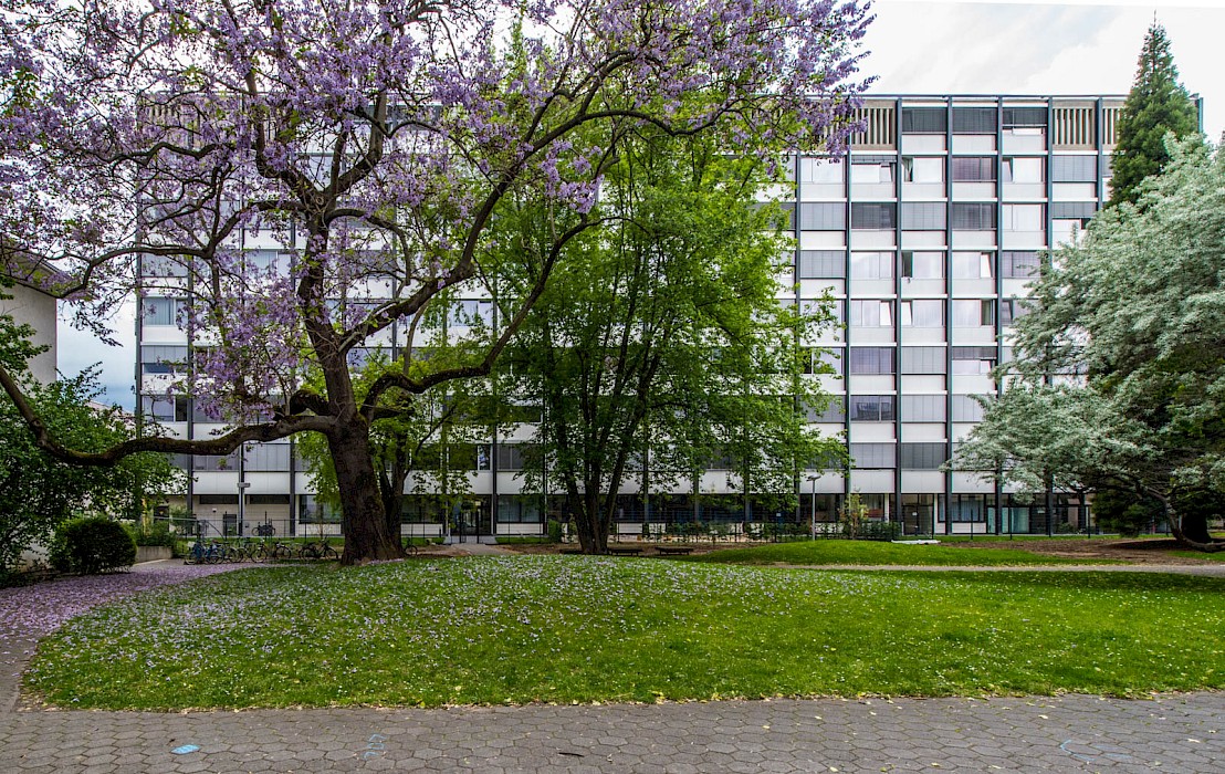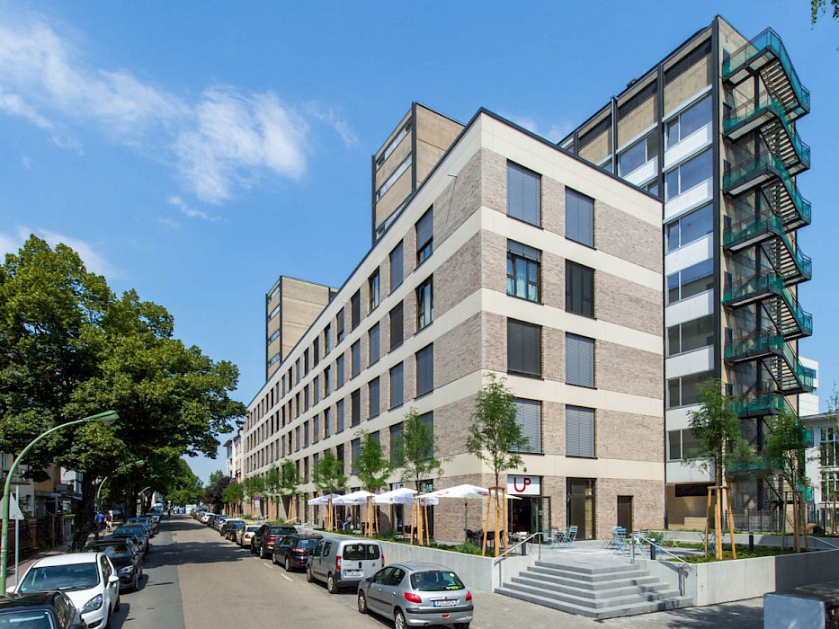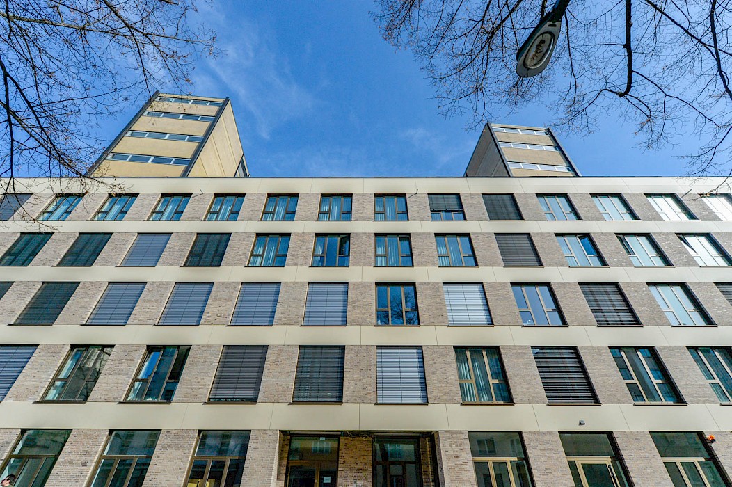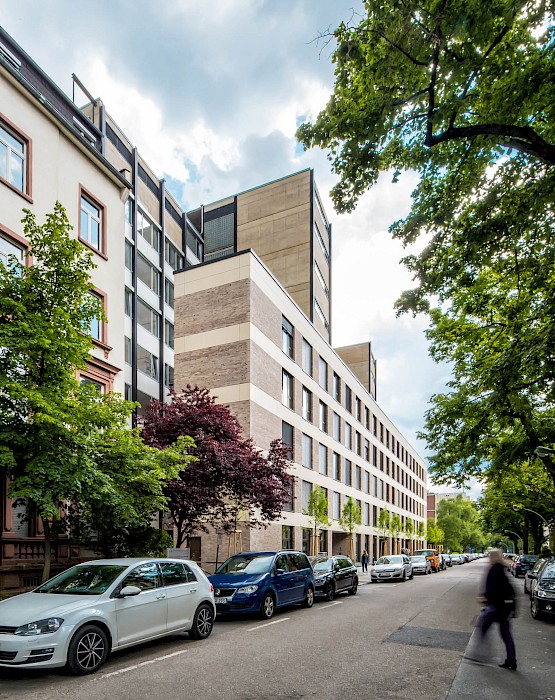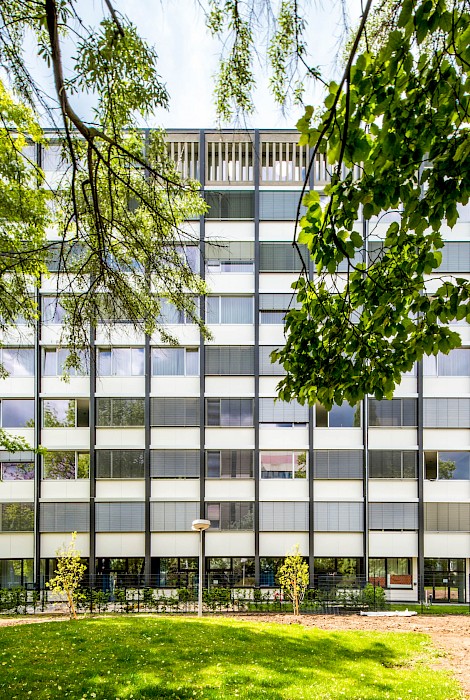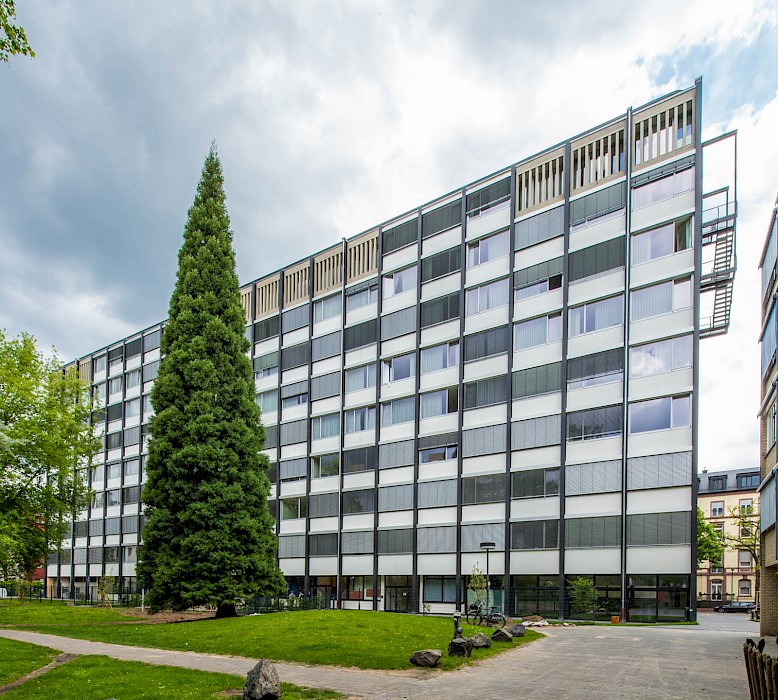 Das zwischen 1958 und 1960 von Ferdinand Kramer für die Frankfurter Goethe-Universität im Stil des Funktionalismus errichtete Philosophicum zählt zu den bedeutendsten Baudenkmälern der Nachkriegsmoderne in Frankfurt. Der Stahlskelettbau mit knapp 80 Metern Länge und 10,58 Metern Tiefe war mit seinem außenliegenden Tragsystem aus Doppel-T-Stützen, den vor der Fassade platzierten Treppenhäusern und dem stützenfreien, flexibel unterteilbaren Innenraum ein Pionierbau seiner Zeit. Dennoch war das Gebäude in der Öffentlichkeit und bei seinen Nutzerinnen und Nutzern gleichermaßen umstritten: Von der Straße abgewandt stand es isoliert im städtischen Raum; zudem führte die nur fünf Zentimeter starke curtain wall-Fassade zu extremen thermischen Schwankungen – so konnte es im Winter bitterkalt und im Sommer unerträglich heiß sein. 2003 wurde der einstige Sitz der philosophischen Fakultät durch den Umzug der Universität an den neuen Campus Westend aufgegeben. Es folgten mehr als zehn Jahre Leerstand, an dessen Ende der Abriss diskutiert wurde. Erst eine Projektgruppe für alternatives Wohnen brachte mit ihrem Engagement für den Erhalt die Wende – ihr Vorhaben der Umnutzung in Wohnungen scheiterte jedoch an der Finanzierung. Schließlich erwarb die RMW Wohnungsgesellschaft das Gebäude und beauftragte Stefan Forster Architekten mit der Planung für die Transformation in ein Studierendenwohnheim mit 238 Appartements, einer Kita und einem Café.