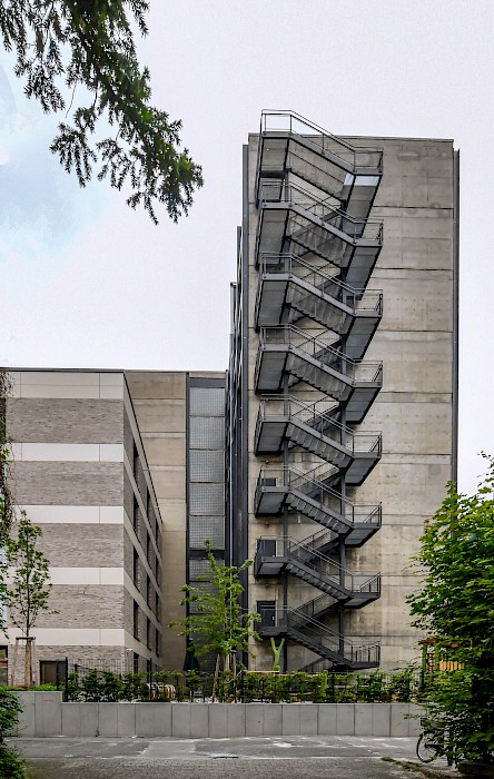 Südseite des Neubaus (links) und des Altbaus mit außenliegender Fluchttreppe (rechts)