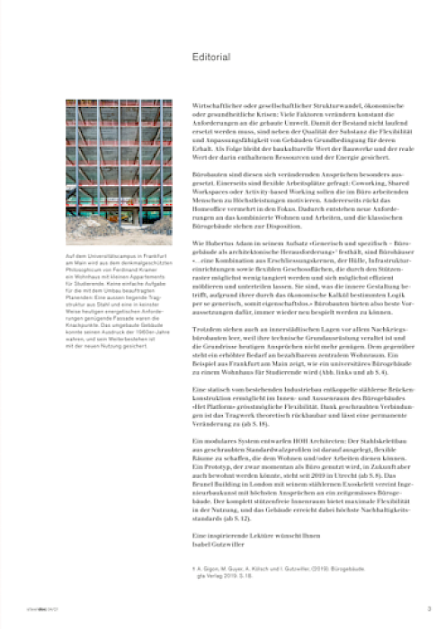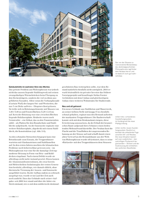 Das Fachmagazin steeldoc, herausgegeben vom Stahlbau Zentrum Schweiz, beschäftigt sich in seiner aktuellen Ausgabe mit der Umwandlung des Philosophicum zu einem Appartementhaus für Studierende. Der Beitrag befasst sich insbesondere mit der konstruktiven Herausforderung, das außenliegende Stahltragwerk denkmalgerecht zu sanieren und zugleich energetisch an heutige Anforderungen anzupassen.