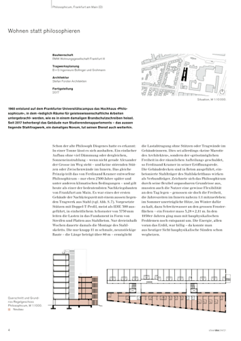 „1960 entstand auf dem Frankfurter Universitätscampus das Hochhaus ‚Philosophicum‘, in dem ‚lediglich Räume für geisteswissenschaftliches Arbeiten untergebracht‘ werden, wie es in einem damaligen Brandschutzschreiben heißt. Seit 2017 beherbergt das Gebäude nun Studierendenappartements – das außen liegende Stahltragwerk, ein damaliges Novum, tut seinen Dienst auch weiterhin.“