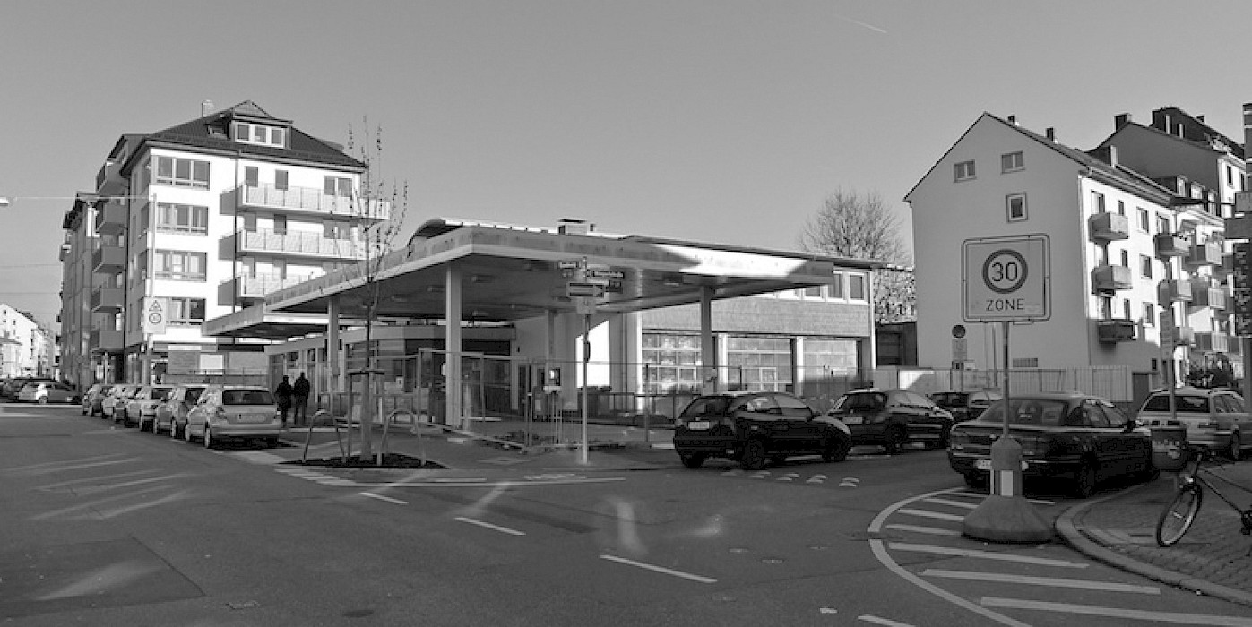 Blick von Westen auf die einstige Shell-Tankstelle an der Ecke Sandweg / Wingertstraße