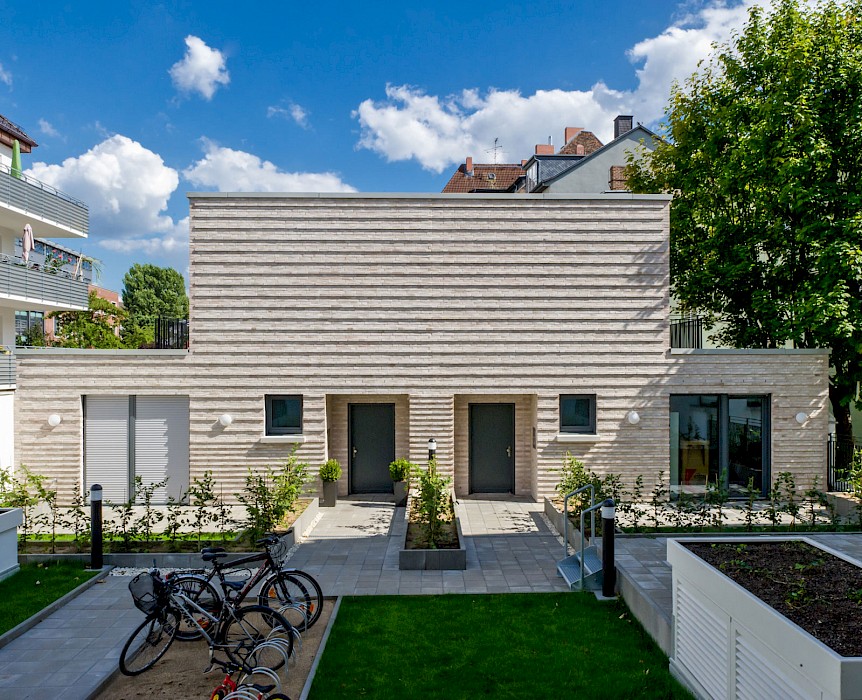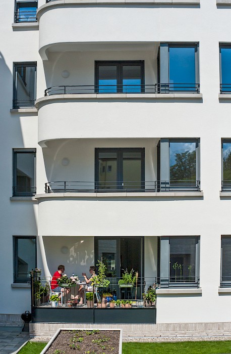 Bei aller Zitierfreude erscheint der Neubau jedoch nicht fremd. Proportionen und Maßstab des Hauses folgen der umliegenden Bebauung und wurden, unter Berücksichtigung der Baufluchten, lediglich neu interpretiert. Wo die Straßenfronten entlang des Sandwegs den Blockrand präzise weiterführen, wird dieser an der Wingertstraße leicht eingerückt. In dem so gewonnenen Abstand zwischen Straße und Haus sind Privatgärten angelegt, die mit einer Klinkermauer und einer dahinterliegenden Hecke – eine für Gründerzeitquartiere typische Vorgartensituation – eingefasst wurden. Details wie der profilierte Klinkersockel, die viertelkreisförmig abgerundeten Balustraden der Loggien und die überhöhten Ecken lassen den Baukörper im Stadtraum leicht und elegant erscheinen. Entstanden sind so flexibel geschnittene und hochwertig ausgestattete Ein- bis Vierzimmerwohnungen mit Privatgärten im Erdgeschoss sowie Balkonen und Loggien bzw. Dachterrassen in den Obergeschossen. Im Innenhof nimmt ein Doppelhaus mit Patio die Dimensionen der früheren Kfz-Werkstatt auf.
