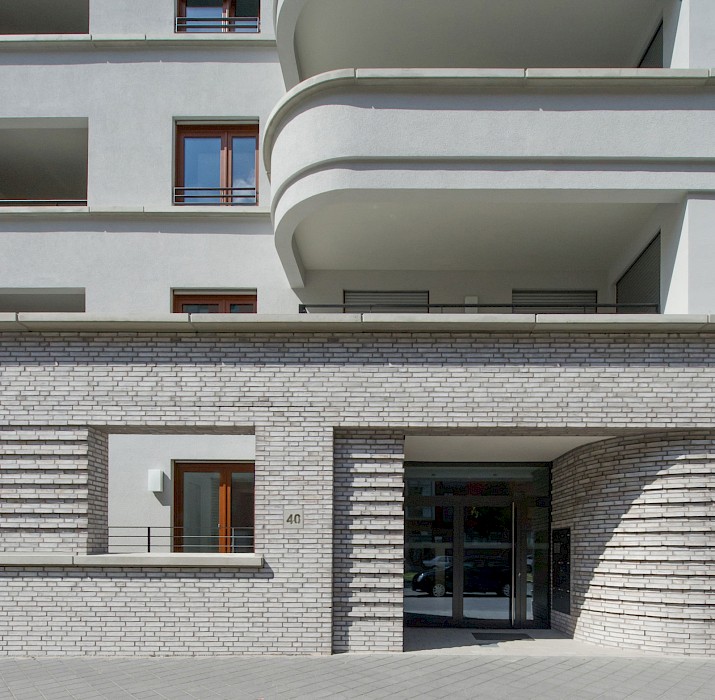 Das Wohngebäude mit hochwertigen Mietwohnungen schließt eine der letzten Baulücken im Frankfurter Westhafen. In direkter Nachbarschaft zum Wohn- und Geschäftshaus „Westgarten 01“ greift es dessen Formensprache auf. Ein heller Klinkersockel betont die Erdgeschosszone und grenzt private Bereiche vom öffentlichen Raum ab. Durchgehende Gesimse und durch einen Putzversatz hervorgehobene Brüstungen betonen die horizontale Gliederung der Fassade. Im Unterschied zum Nachbargebäude stehen dagegen der hellgraue Putz und der symmetrische Aufbau der Fassade mit einer zurückspringenden Mittelzone. Ein zweifaches Staffelgeschoss mit großen Dachterrassen schließt das Gebäude nach oben plastisch ab. Dem Fassadenaufbau entspricht die Erschließung über zwei seitlich gelagerte Treppenhäuser mit je drei Wohnungen pro Geschoss (3-Spänner-Typ). Jede Wohnung verfügt über eine Loggia zur Straßen- und einen Balkon zur Hofseite. Insgesamt entstanden 39 Wohnungen.