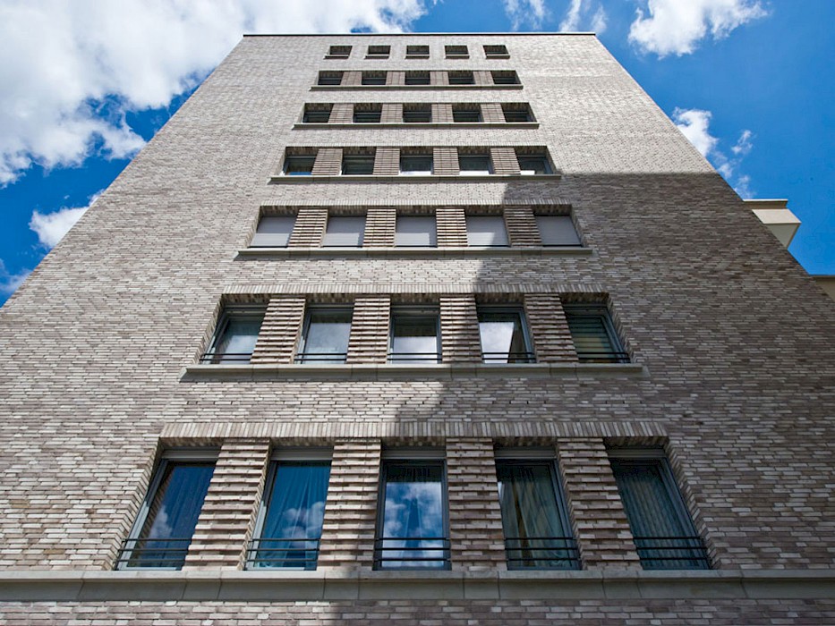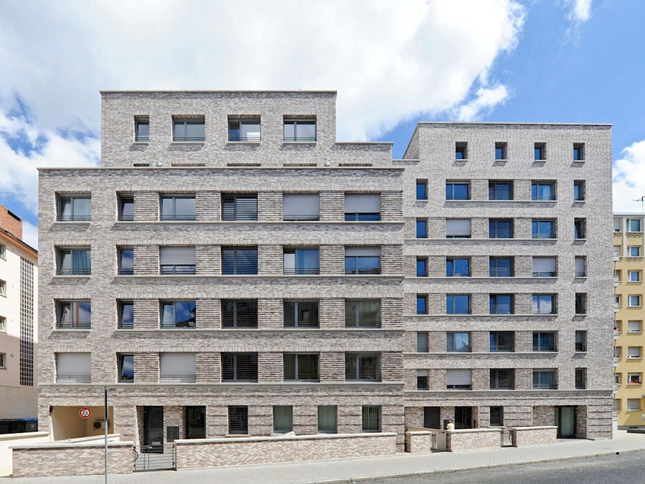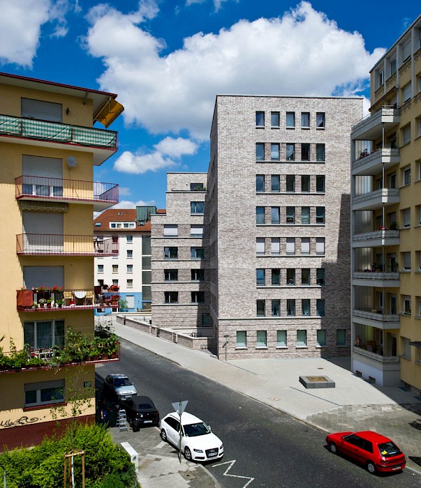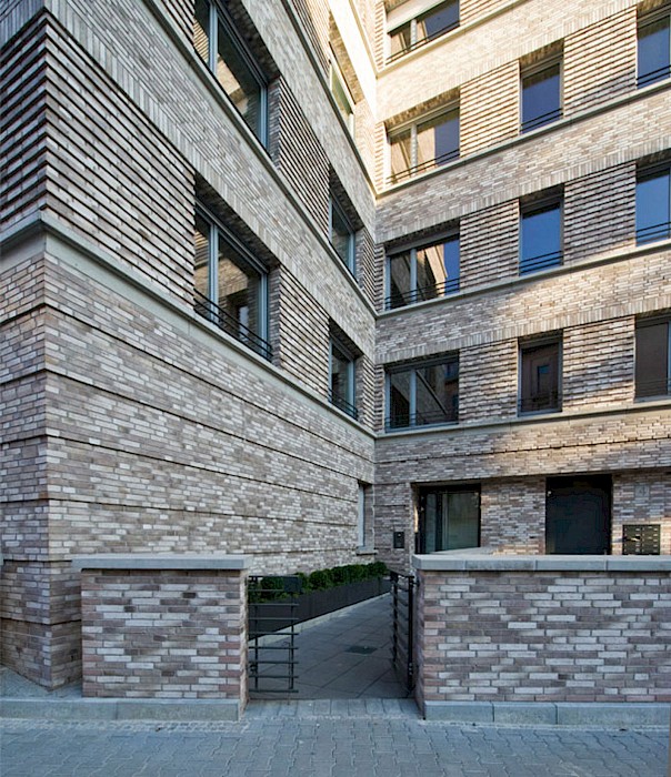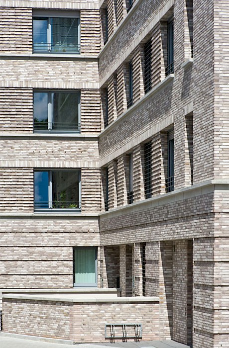 Besondere Sorgfalt wurde auf die Materialisierung des Gebäudes gelegt, dessen massive, zweischalige Fassade aus hellbeigen Klinkern im wilden Verband an drei Seiten die Gebäudehülle bildet. Die rustikale Anmutung der im Wasserstrichverfahren produzierten Klinkersteine im Verbund mit den hellgrauen, leicht zurückversetzten Fugen verstärkt die monolithische Wirkung des Baukörpers, der seine Lebendigkeit einzig der aufwändigen Profilierung und dem feinen Farbspiel der Steine verdankt. Durch den regelmäßigen Rücksprung zweier Klinkerlagen im Sockelbereich ergibt sich zudem der Eindruck von horizontalen »Kanneluren« – ein Prinzip, das in den Obergeschossen durch umlaufende Gesimse, die Grenadierschicht über den Fenstern und einen Rillenverband zur Betonung der Fensterbänder fortgeführt wird. Die im selben Stein ausgeführte Grundstücksmauer betont den Zusammenhang des Ensembles und markiert zugleich die Straßenflucht, während sich die Hofseite – im Kontrast zur geordneten Vorderseite – mit durchgehenden Balkonen zum Lameygarten, einer aus dem 19. Jahrhundert stammenden städtischen Parkanlage, öffnet.