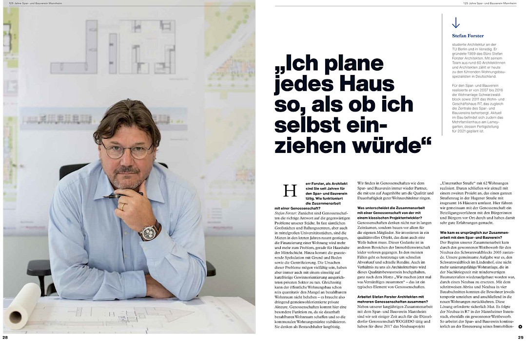 Aus Anlass ihres 125-jährigen Jubiläums zieht die Mannheimer Baugenossenschaft „Spar und Bau“ in einer aktuellen Publikation Bilanz. Im Interview äußert sich Stefan Forster zur langjährigen Zusammenarbeit, aus der die Projekte Schwarzwaldblock, R7 und Lameygarten hervorgegangen sind.