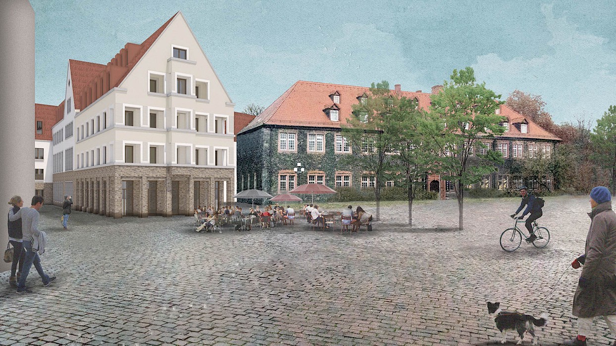 Der Entwurf sieht gezielte Eingriffe in den Bestand vor, die den Charakter der Altstadt prinzipiell erhalten und aufwerten. Das Volumen wird hierbei in einem U-förmigen Baukörper gegliedert, der unter den umliegenden Stadtraum eindeutig neu definiert und somit klar ablesbare Plätze schafft, die unterschiedlich thematisiert werden. Durch strategische Eingriffe (teilweisen Rückbau, Umbau und Erweiterung) soll das wenig ortstypische Bestandsgebäude aus den 1980er-Jahren funktionell umgenutzt und der Baukörper sinnvoll in die kleinteilige Altstadt integriert werden. Die neu entwickelten Fassaden reagieren differenziert auf die drei angrenzenden Plätze. Auch die Eingangssituation am Willy-Brandt-Platz wird durch einen Giebel und einen Erker neu definiert. Ein umlaufender Sockel aus beigefarbenem Naturstein nimmt lokale Bautraditionen auf und verstärkt die Ensemblewirkung.