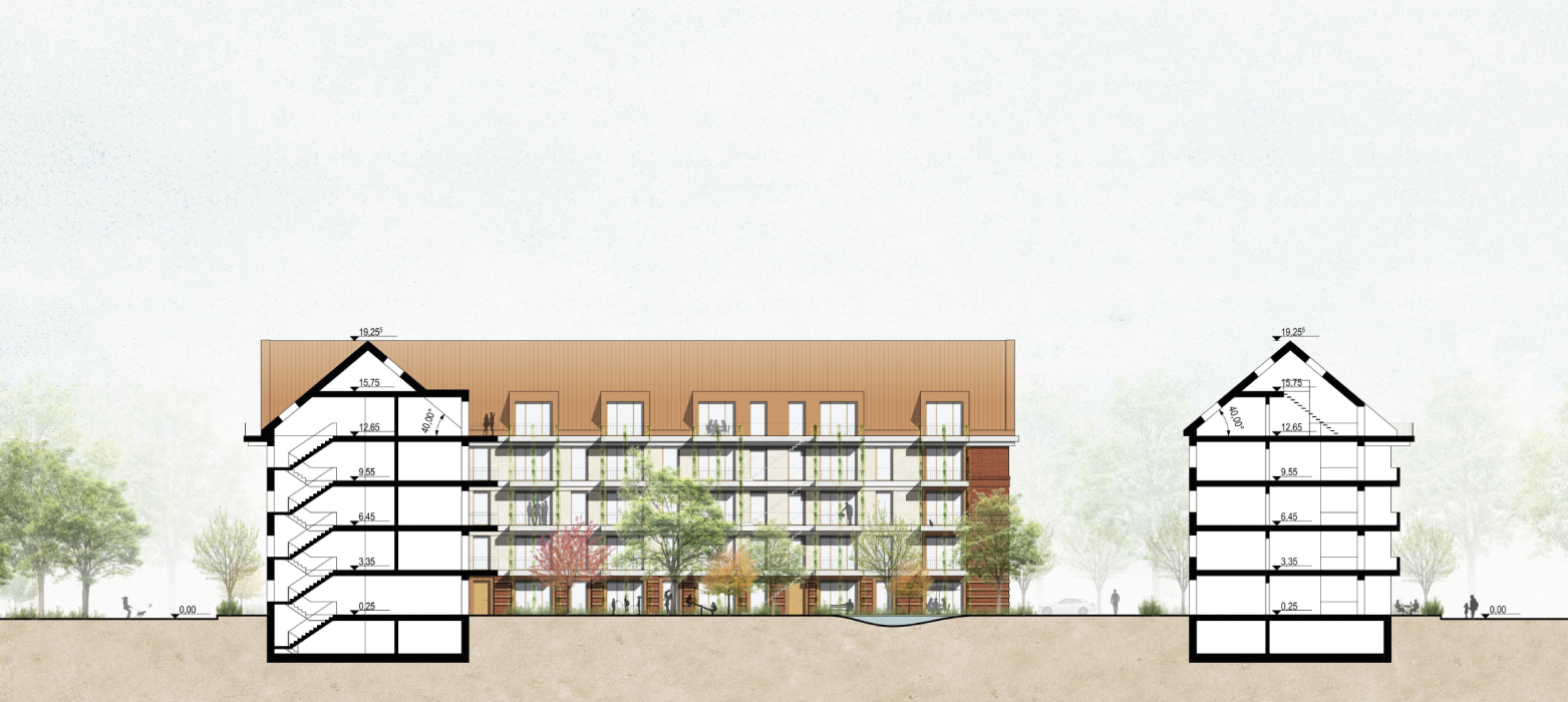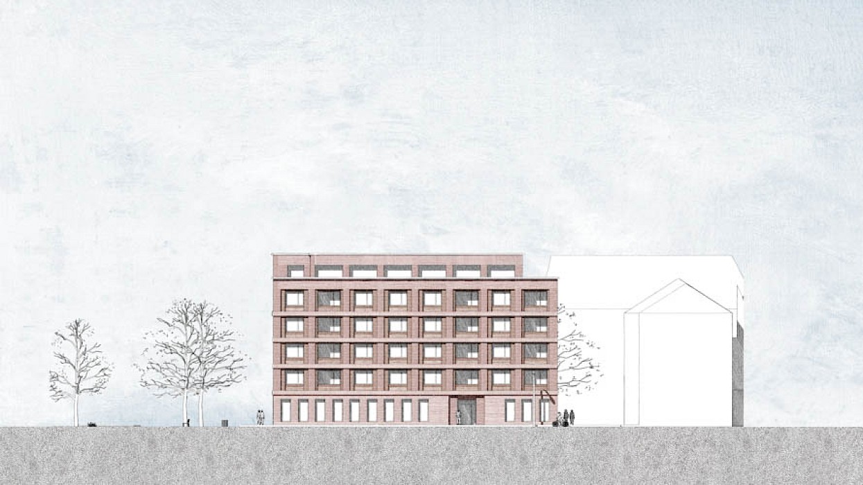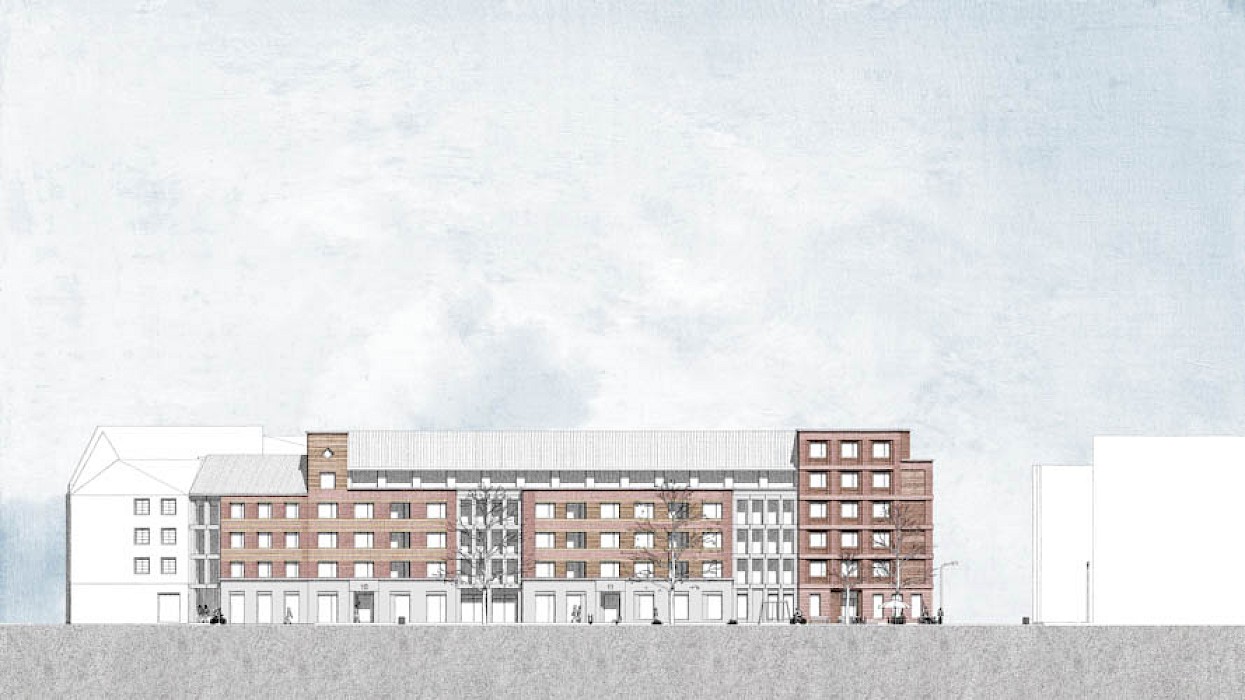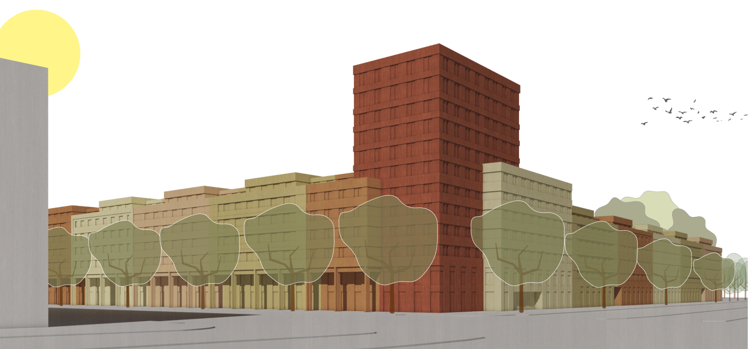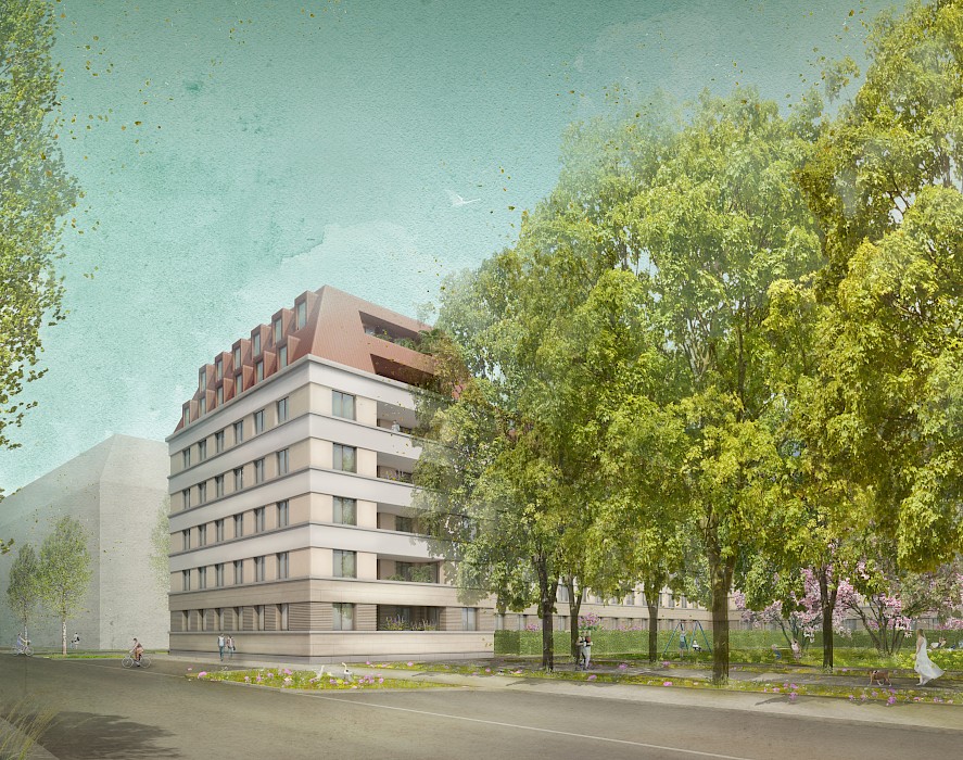 Durch seine sich ins Stadtbild eingliedernde Kubatur leistet der Entwurf einen Beitrag zur Stadtreparatur. Das weitestgehend 6-geschossige Gebäude schafft mit einem 8-geschossigen Hochpunkt den Auftakt des Quartiers. Die Riegelbauten fassen den Innenhof ein und bieten den Bewohnern Privatsphäre. Loggien, Balkone und Terrassen bieten allen Wohnungen einen zusätzlichen privaten Außenraum. Der Sockelbereich beherbergt Gewerbeeinheiten, während die oberen Geschosse geförderte Wohnräume bilden. Der ökologische Fußabdruck während der Bauphase, sowie die Baukosten, sollen durch Simplizität und Klarheit in der Planung minimiert werden.