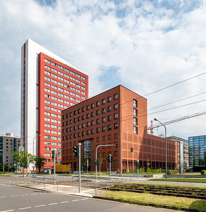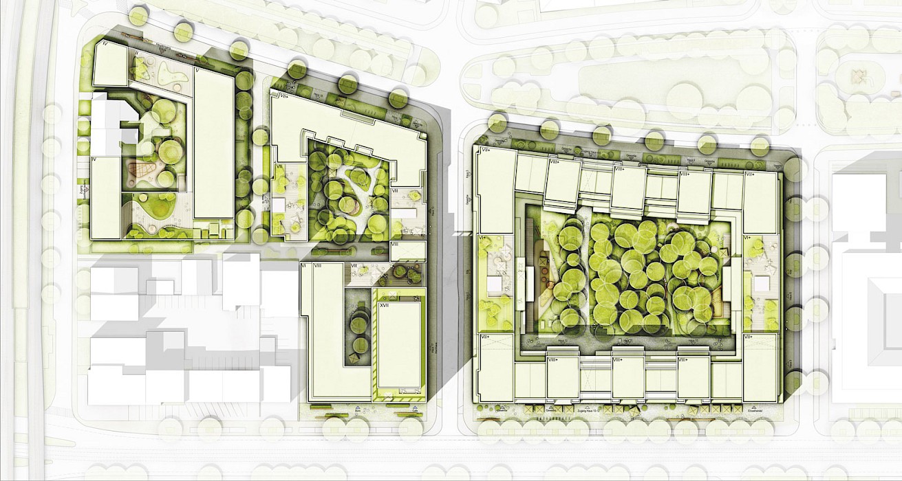 Das städtebauliche Konzept schreibt die Blockstruktur fort und entwickelt die Blockinnenbereiche zu gemeinschaftlich nutzbaren Höfen weiter. Die intensiv begrünten Höfe leisten einen wichtigen Beitrag zur Verbesserung des Mikroklimas und bieten einen kollektiven Raum für die Bewohnerinnen und Bewohner. Die 16 Wohnhäuser verteilen sich auf drei Straßenblöcke und werden um ein 17-geschossiges Hochhaus – in den ersten sieben Geschossen befinden sich Büros, darüber Wohnungen – an der Ecke von Mainzer Landstraße und Hellerhofstraße ergänzt.