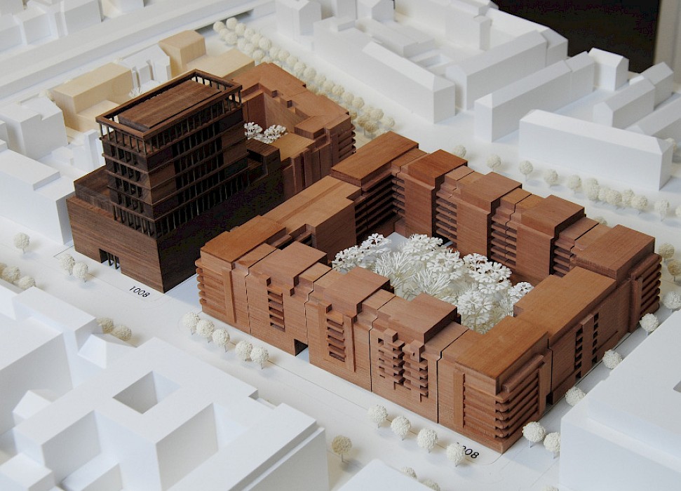 Der Beitrag von Stefan Forster sieht eine Schließung der bisher offenen Zeilenbebauung vor. Mit seiner aufwändig gegliederten, profilierten Fassade öffnet sich der Baukörper an der Westseite zum Quartiersplatz. Insbesondere die Bezüge zum lokalen Kontext wurden von der Jury hervorgehoben: „Die Verfasser schlagen eine prägnante, sich mit den Prägungen des Quartiers auseinandersetzende Bebauung vor, die differenziert in Kubatur und architektonischem Ausdruck eine angemessene Antwort für die gestellte Aufgabe bieten kann.“