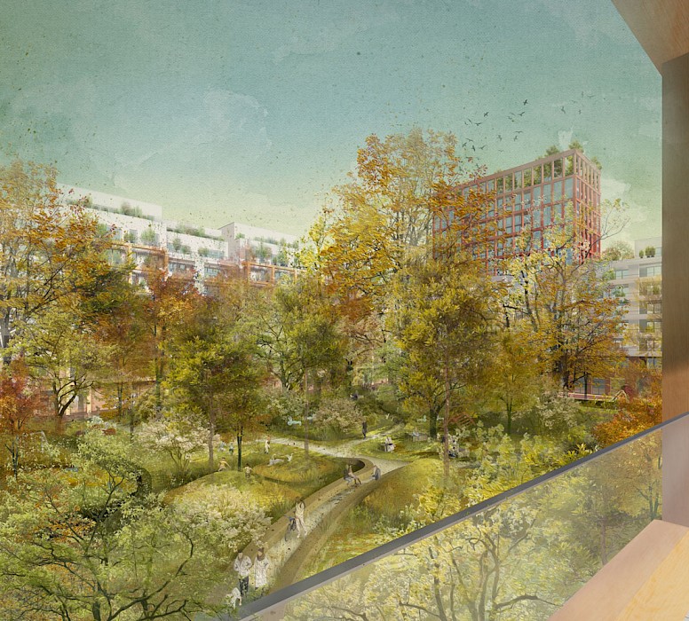 Der vorhandene Grünraum zieht sich in die neue Bebauungsstruktur hinein und bietet attraktive Freianlagen. Der Grünraum entlang der Gleise wird durch den neuen Quartierspark erweitert. Der ausreichende Abstand zu den Bahngleisen reduziert die Schallimmissionen des Verkehrs im Entwurfsgebiet.