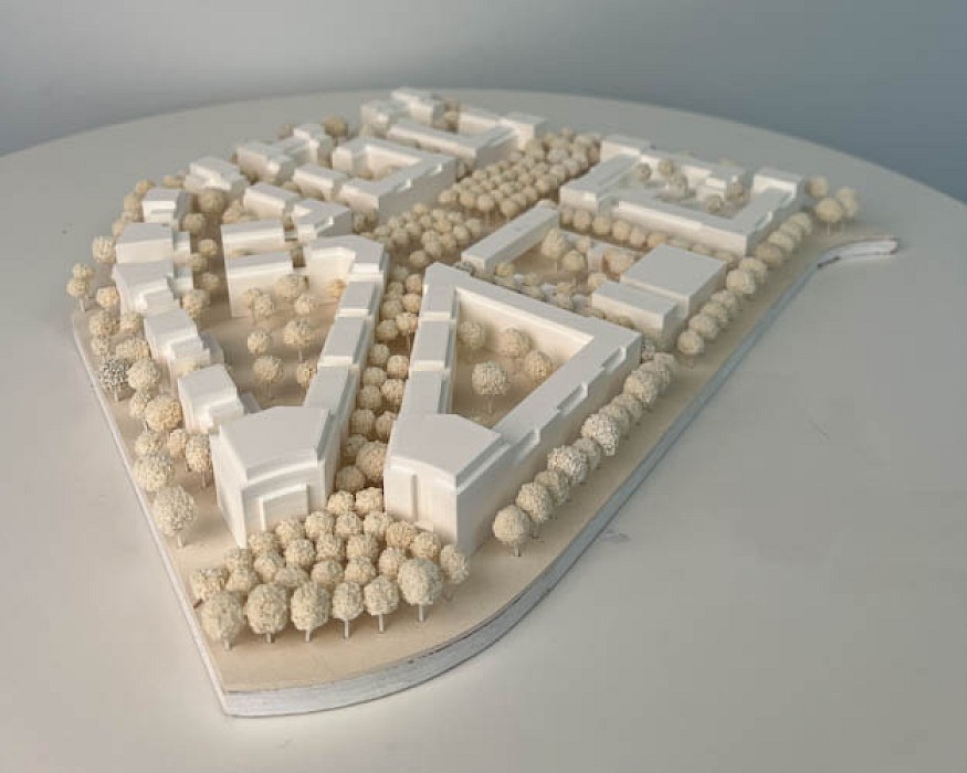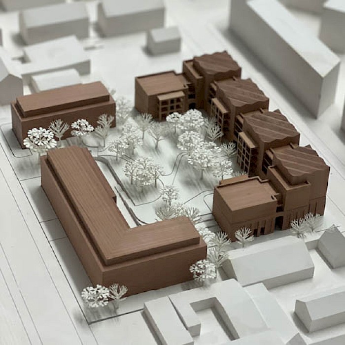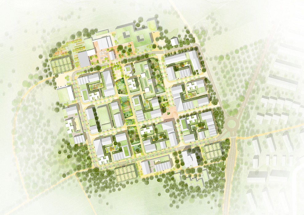 Die städtebauliche Setzung soll eine hohe Dichte und einen möglichst geringen Fußabdruck an bebauter Fläche aufweisen. Das städtebauliche Konzept beinhaltet eine zusammenhängende Figur, die sich mit dem umliegenden Landschaftsraum verwebt.