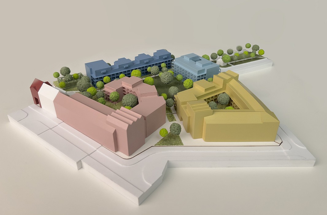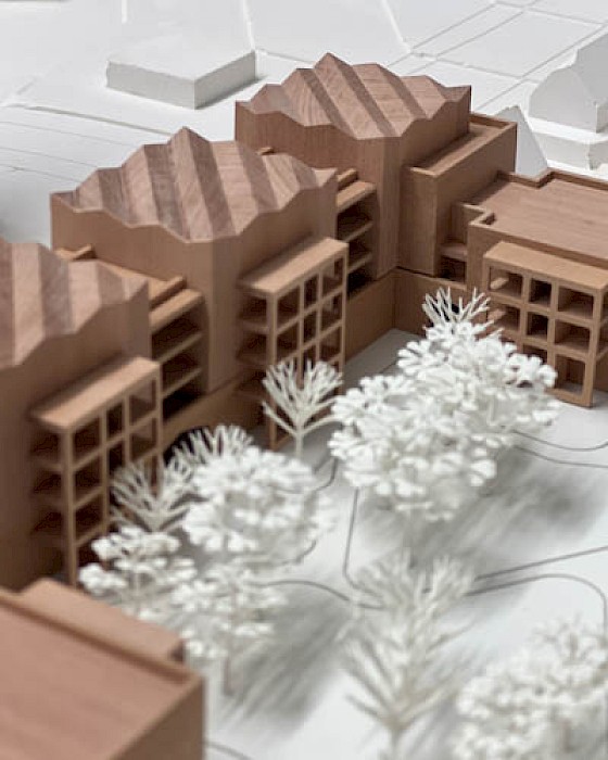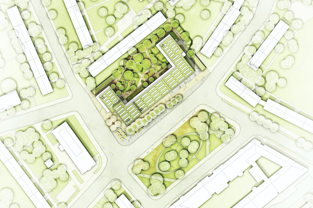 Dieser Entwurf sieht ein Ensemble aus vier unabhängigen Gebäudevolumen entsprechend der vorgegebenen Nutzungsarten auf drei Baufeldern vor. Jedes dieser vier Gebäudevolumen ist durch seine eigene Form in diesem Quartier einzigartig und auf die jeweilige Begebenheit zugeschnitten. Dadurch entstehen öffentliche, halböffentliche und private Bereiche, die den Besuchern und Anwohnern unterschiedliche Qualitäten anbieten. Diese vielfältigen Qualitäten werden auch durch die vorgeschlagenen Grünflächengestaltung und Landschaftsarchitektonik verstärkt, die durch ein differenziertes Angebot vielseitige Wohn- und Begegnungslandschaften mit eigenständiger Identität entwickeln.